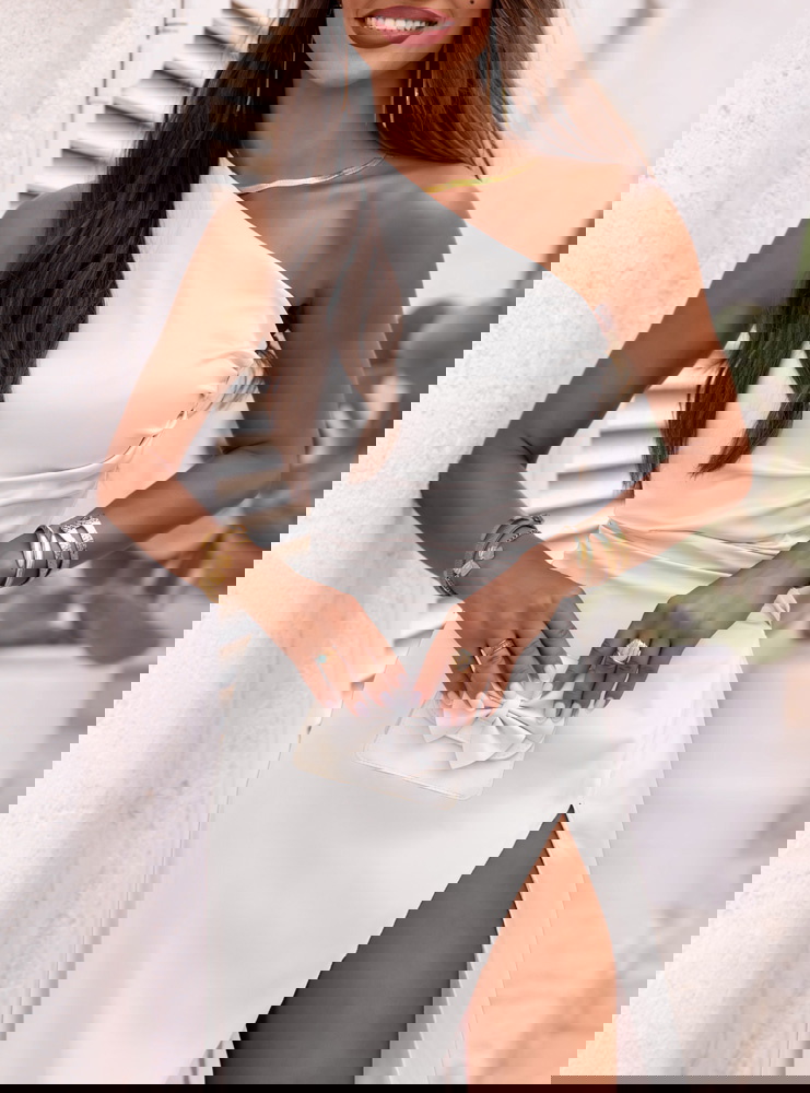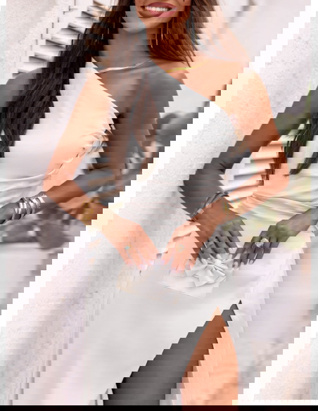 Biała satynowa sukienka na jedno ramię Rossella to propozycja, która zachwyca swoją wysublimowaną formą. Subtelny, asymetryczny dekolt zwraca uwagę i podkreśla linię ramion. Gładka powierzchnia kreacji nadaje stylizacji lekkości i płynności. Długość maxi tworzy efektowną, elegancką sylwetkę. Jedno ramię eksponuje obojczyk i dodaje całości odważnego charakteru. Sukienka pięknie układa się podczas każdego ruchu, zapewniając efektowną oprawę. Minimalistyczny fason pozwala skupić się na atutach sylwetki. Biel nadaje świeżości i sprawia, że sukienka staje się ponadczasowym elementem garderoby. Zamek z tyłu ułatwia zakładanie i gwarantuje idealne dopasowanie. Ten model to doskonały wybór dla kobiet, które chcą wyróżnić się subtelną elegancją.