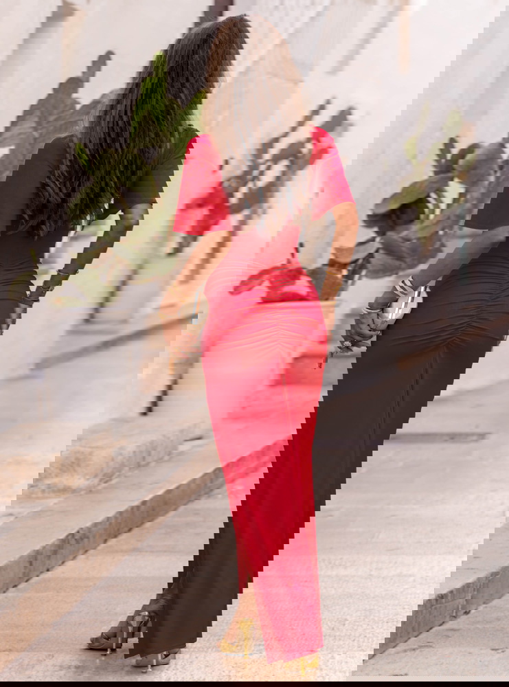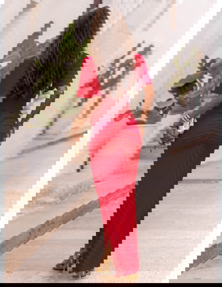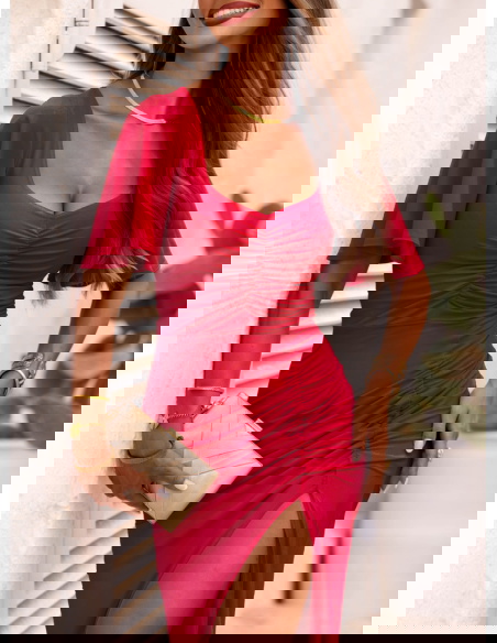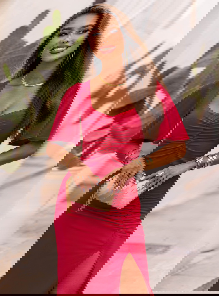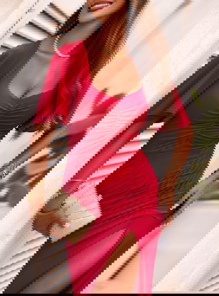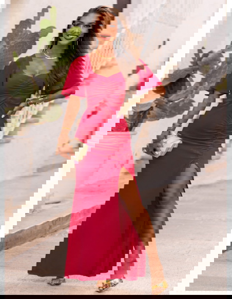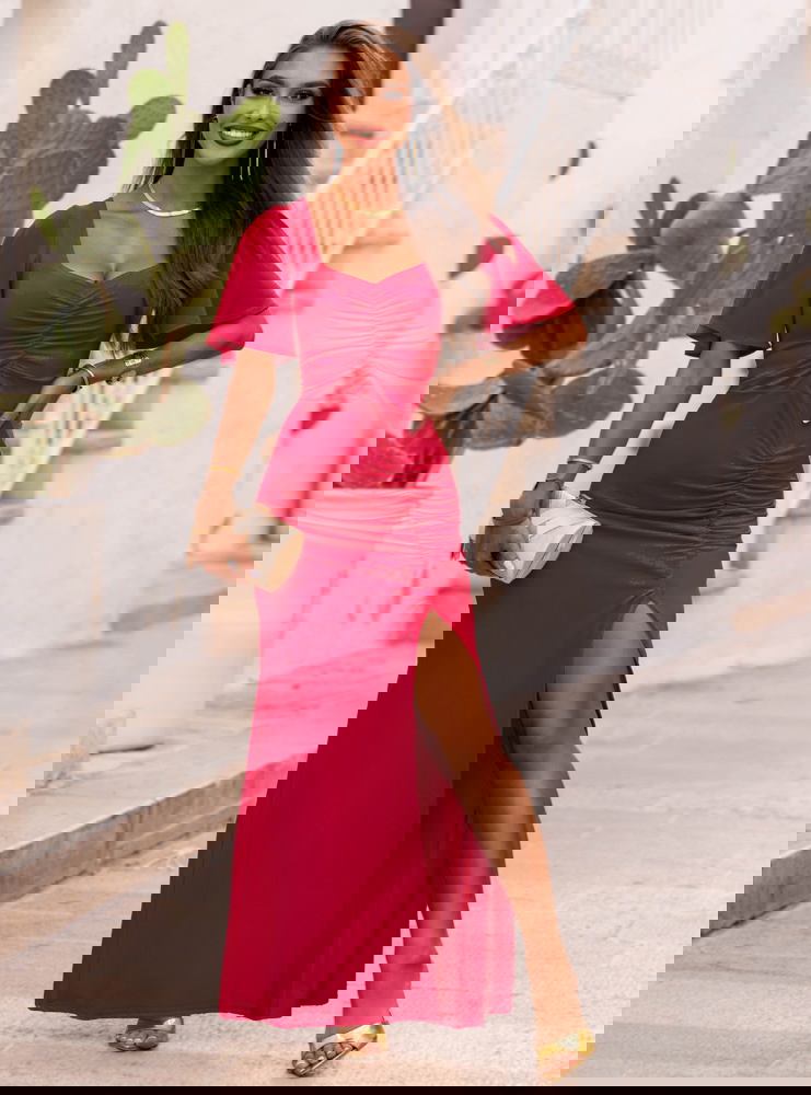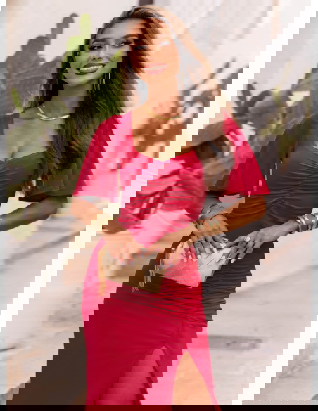 Malinowa długa sukienka z rozcięciem Ianira to połączenie szyku i wygody, które pokocha każda kobieta. Intensywny kolor pięknie harmonizuje z opalenizną, podkreślając naturalny blask skóry.