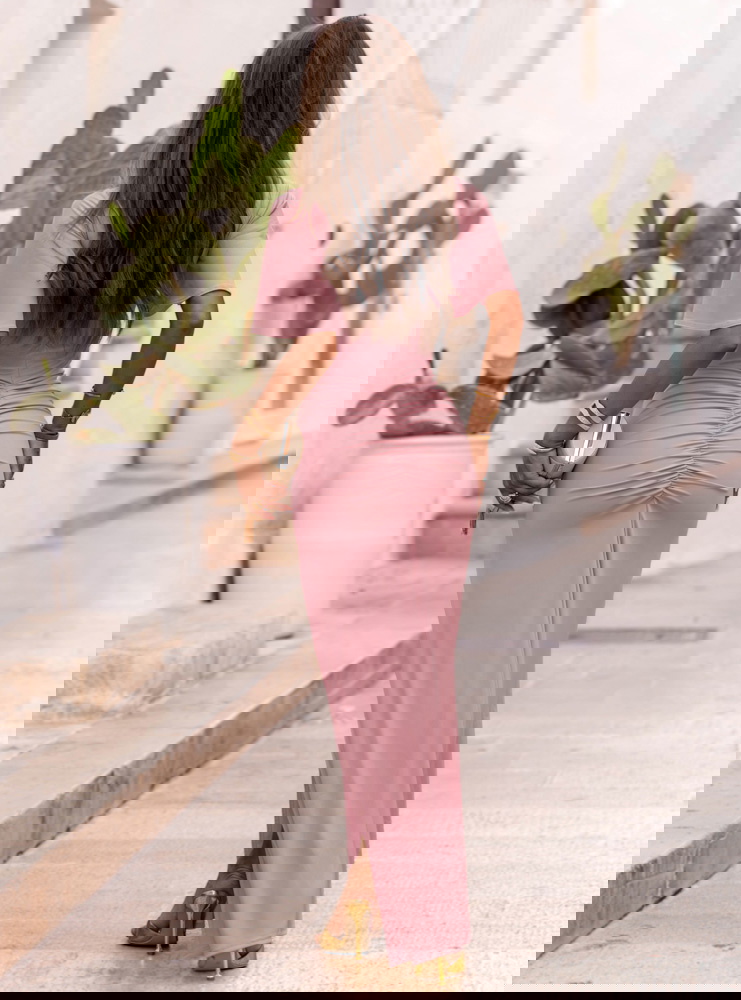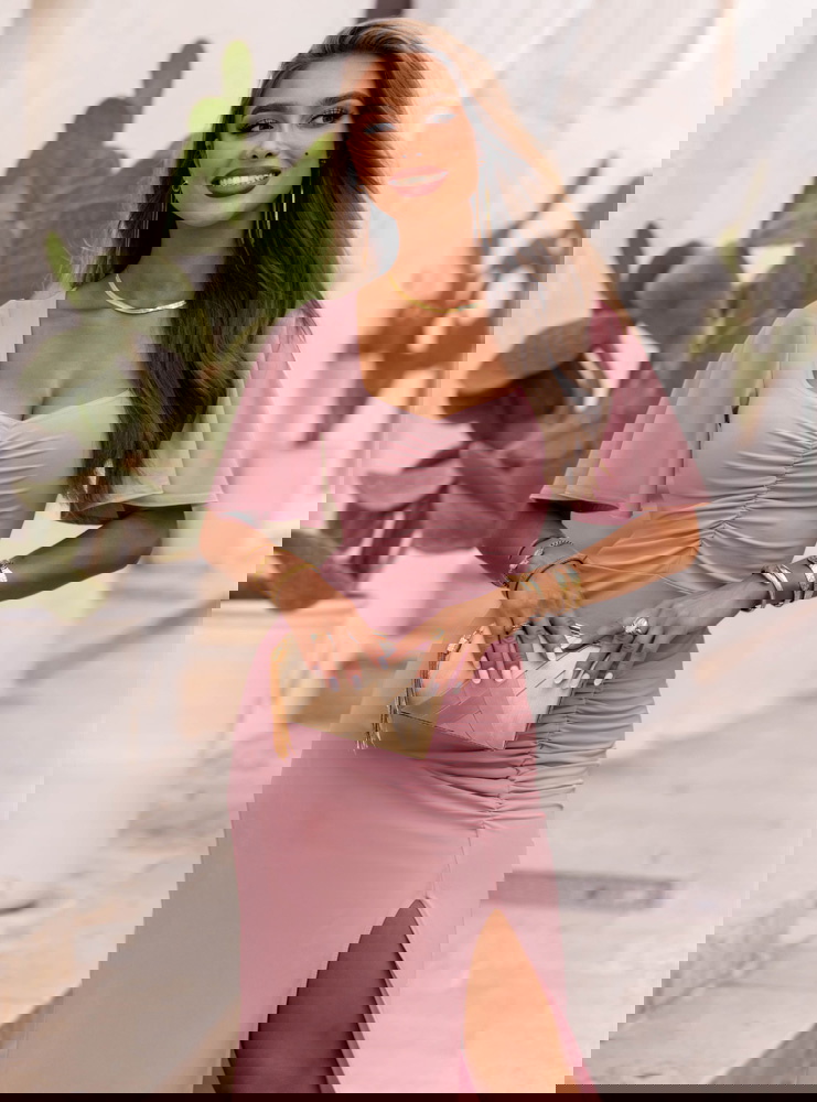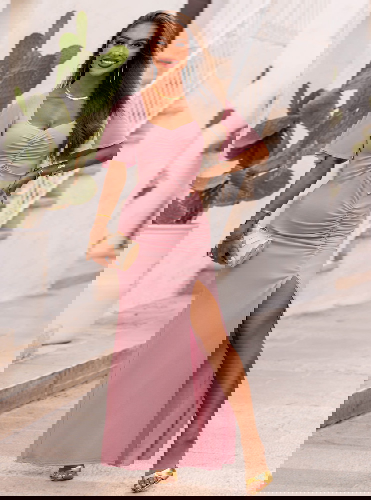 Długa sukienka z rozcięciem Ianira - brudny róż to wyjątkowa propozycja dla kobiet, które kochają połączenie subtelności i kobiecego uroku. Już na pierwszy rzut oka zachwyca swoją nietuzinkową formą i odcieniem, który wpasowuje się w najnowsze trendy. Jej delikatny kolor sprawia, że całość wygląda lekko i romantycznie, idealnie podkreślając urodę. Dopasowany krój pięknie modeluje sylwetkę, eksponując atuty figury. Efektowne marszczenie z przodu dodaje stylizacji ciekawego akcentu, a głęboki rozporek w spódnicy nadaje odrobinę zmysłowości. To sukienka, która sprawdzi się zarówno w eleganckim, jak i półformalnym wydaniu. Stylowe rękawki typu motylek dodają jej lekkości i swobody. To idealny wybór, jeśli szukasz czegoś wyjątkowego, ale nieprzesadzonego. Sukienka ma w sobie balans między nowoczesną formą a kobiecą klasyką. Jeśli marzysz o kreacji, która przyciągnie spojrzenia – właśnie ją znalazłaś.