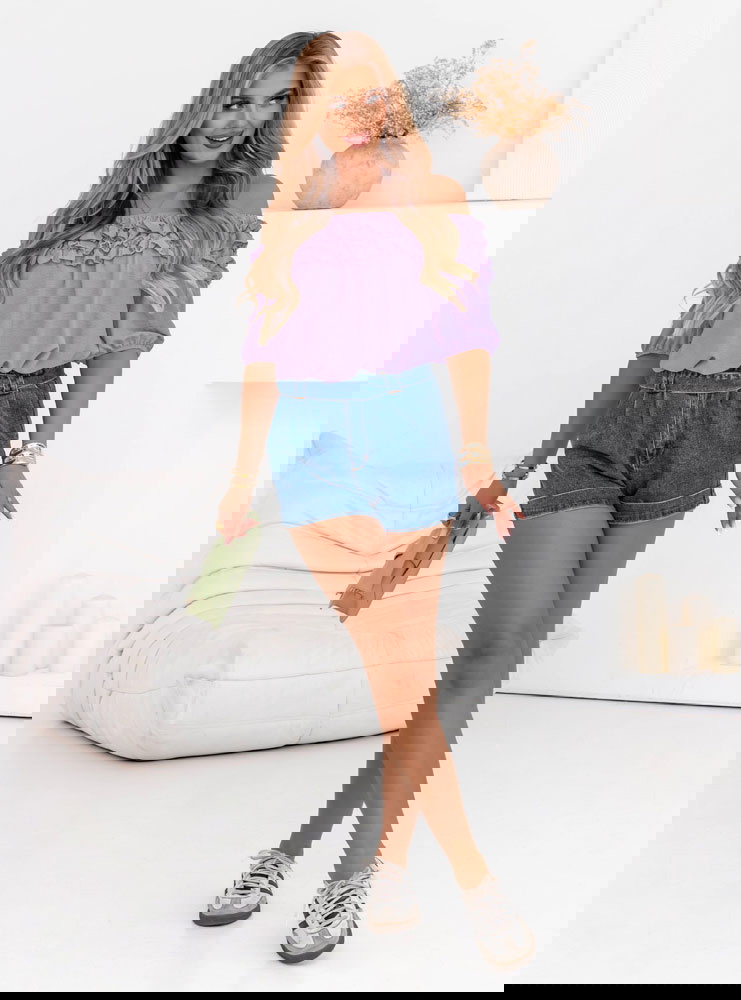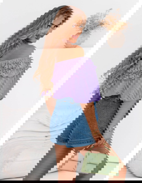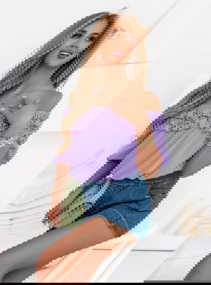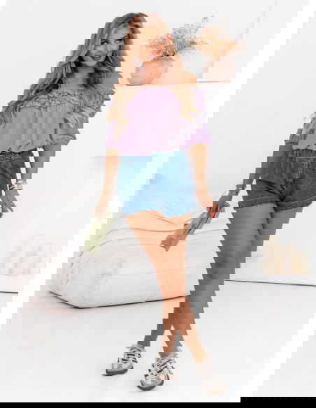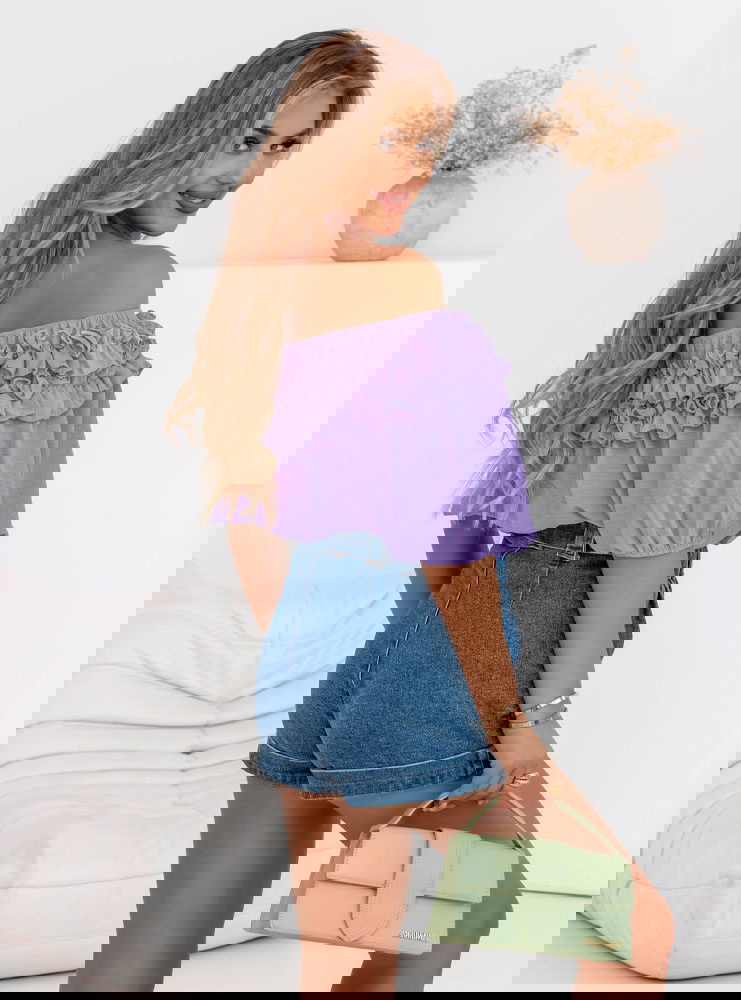 Liliowa bluzka hiszpanka z falbankami Elicja idealnie sprawdzi się na letnie wyjścia, spacery, festiwale czy spotkania z przyjaciółkami. To doskonała opcja na romantyczną kolację na świeżym powietrzu lub wakacyjny city break.