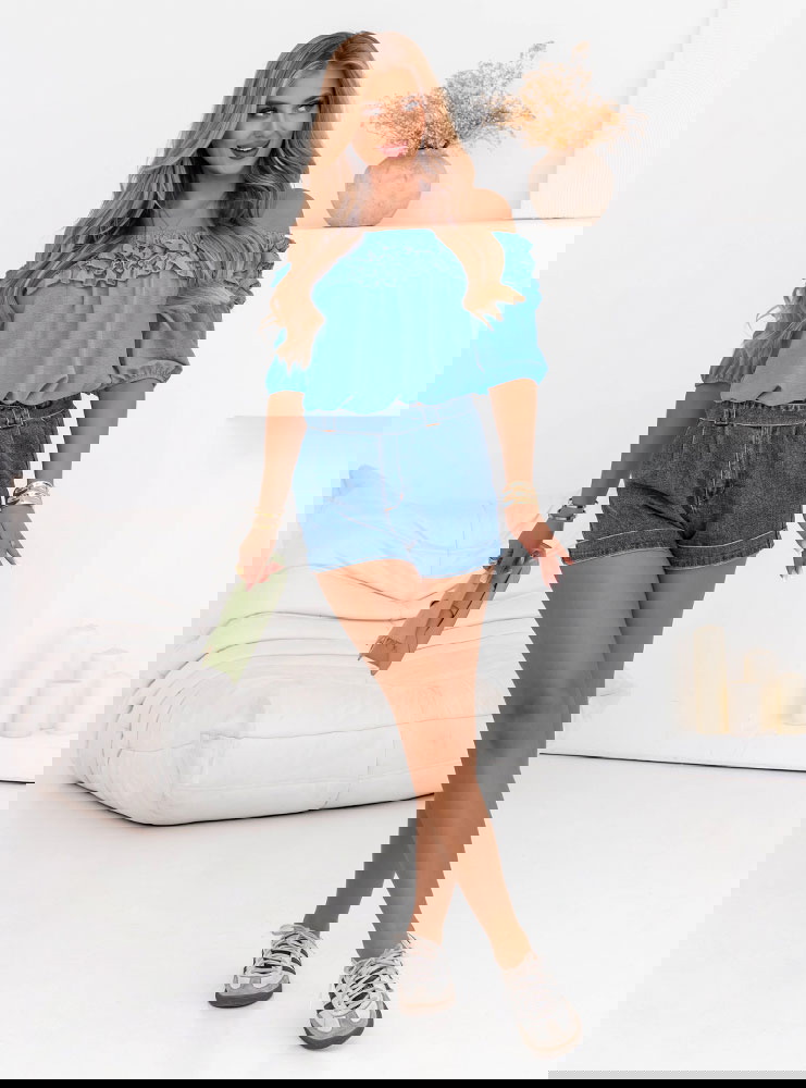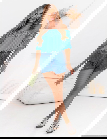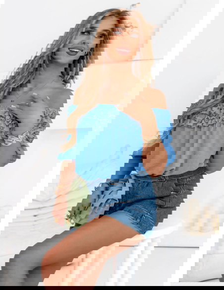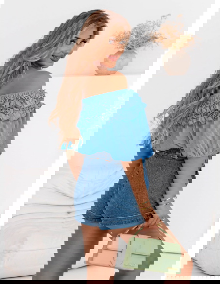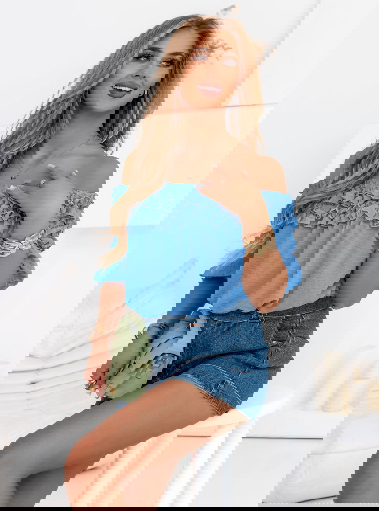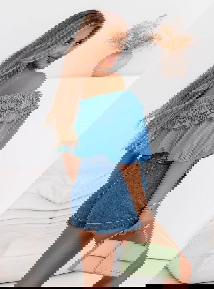 Błękitna bluzka hiszpanka z falbankami Elicja to idealna bluzka na wakacyjne wyjazdy, spacery w słońcu i letnie festiwale. Świetnie sprawdzi się na popołudniową kawę z przyjaciółką, randkę pod chmurką czy dzień na plaży.