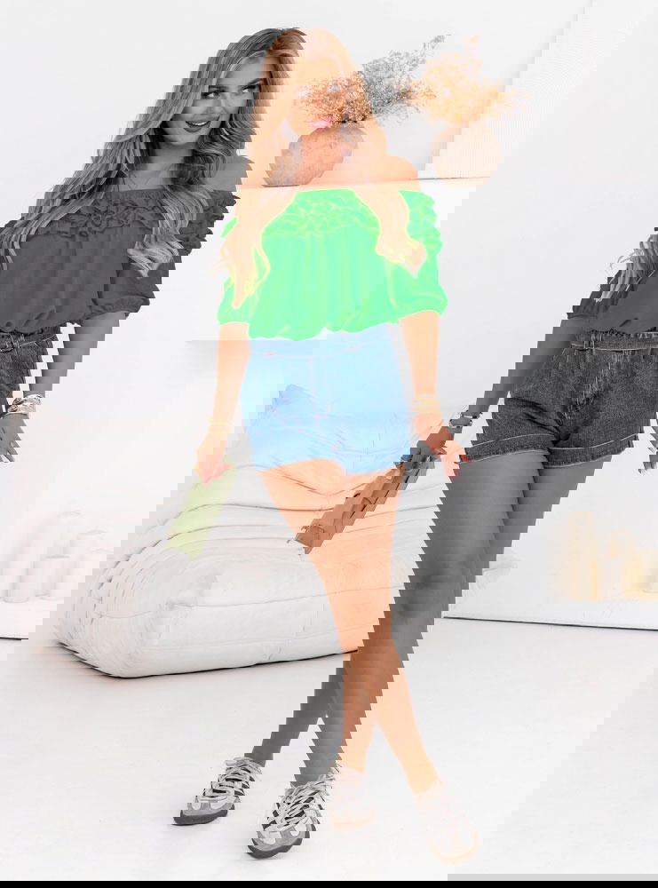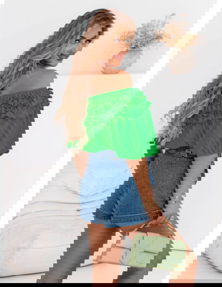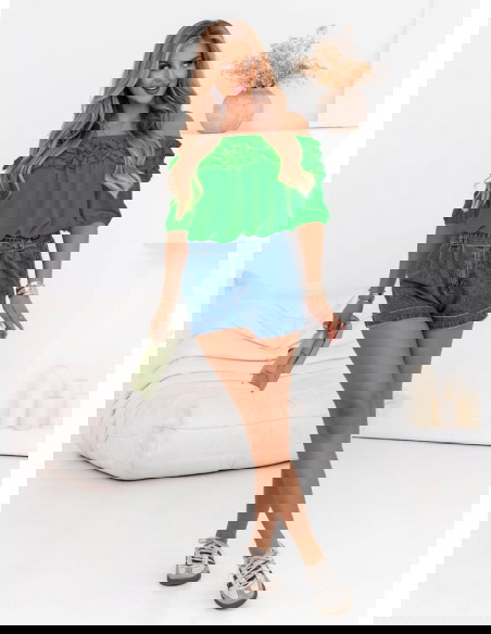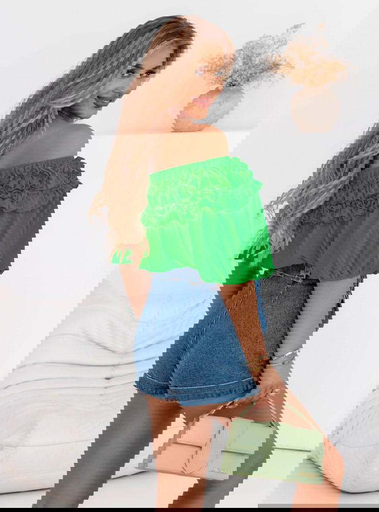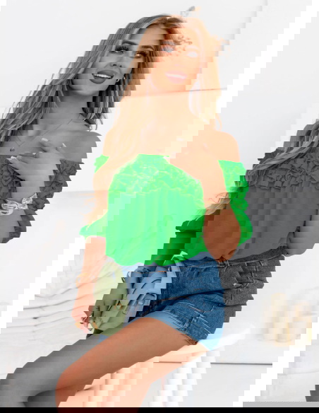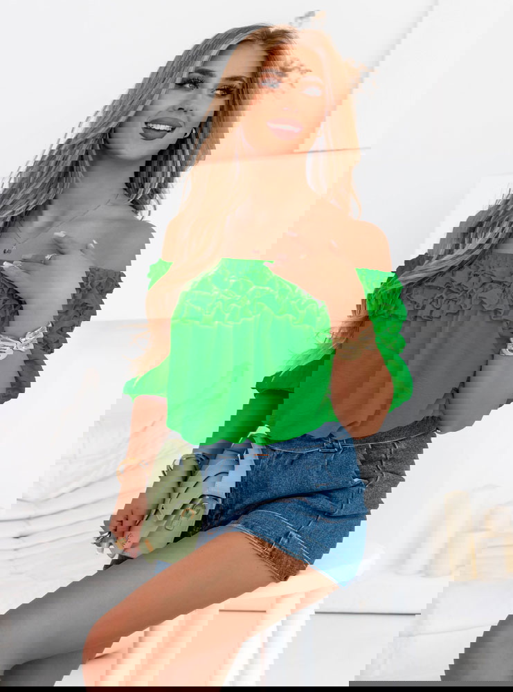 Zielona bluzka hiszpanka z falbankami Elicja sprawdzi się świetnie na letnie spotkania, spacery czy wakacyjne wyjazdy. Będzie doskonałym wyborem na lunch z przyjaciółkami, letnie festiwale czy randkę w plenerze.