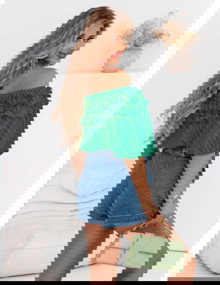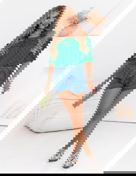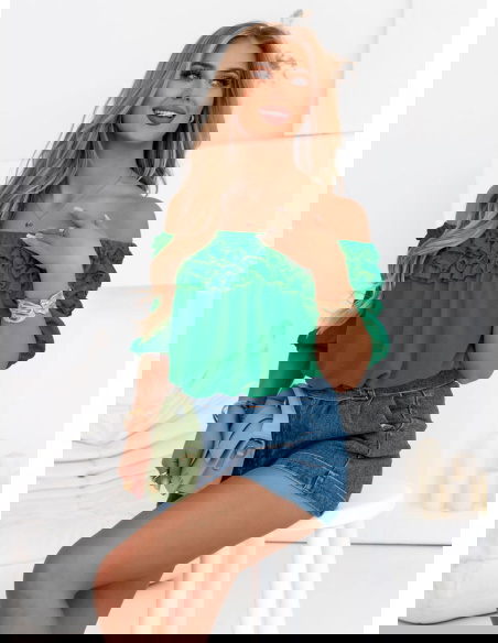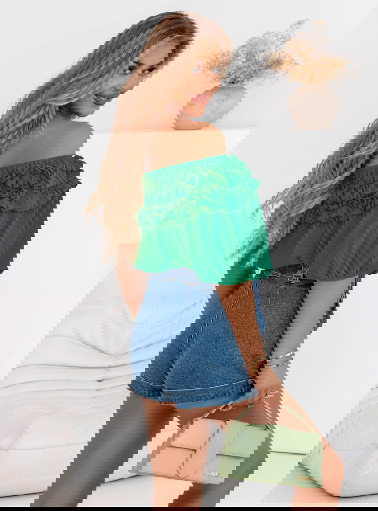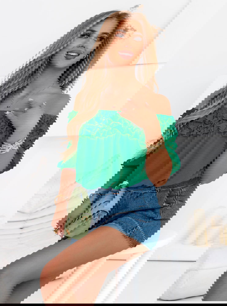 Bluzka hiszpanka z falbankami Elicja - butelkowa zieleń doskonale sprawdzi się podczas letnich dni – na wakacjach, spacerach czy plenerowych spotkaniach. Idealna na randki, kolacje na tarasie lub weekendowe wypady za miasto.