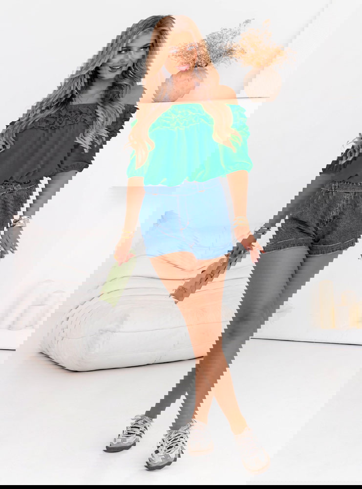 Bluzka hiszpanka z falbankami Elicja - butelkowa zieleń to propozycja, która zachwyca intensywnym kolorem i kobiecym fasonem. Głęboka zieleń przyciąga spojrzenia i dodaje wyrazistości każdej stylizacji. Dekolt typu hiszpanka z falbankami pięknie eksponuje ramiona, tworząc subtelny, zmysłowy efekt. To model, który idealnie podkreśla letni charakter stylizacji, a przy tym świetnie sprawdza się również w bardziej eleganckich wersjach. Luźny fason zapewnia wygodę i swobodę noszenia, nawet w cieplejsze dni. Krótkie rękawy zakończone delikatnym ściągaczem dodają lekkości i dziewczęcego uroku. Bluzka świetnie komponuje się z jeansami, szortami czy spódnicami – to baza do wielu modnych zestawów. Falbanki w górnej części nadają całości romantycznego wyrazu, nie przytłaczając sylwetki. To wybór idealny dla kobiet, które lubią połączenie klasyki z odrobiną świeżości. Jeśli szukasz letniego akcentu, który wyróżni Twoją stylizację – ta hiszpanka będzie idealna.
