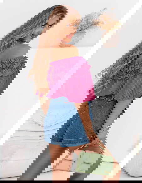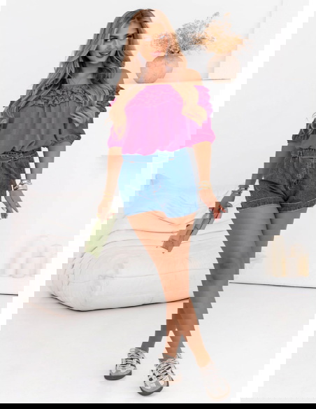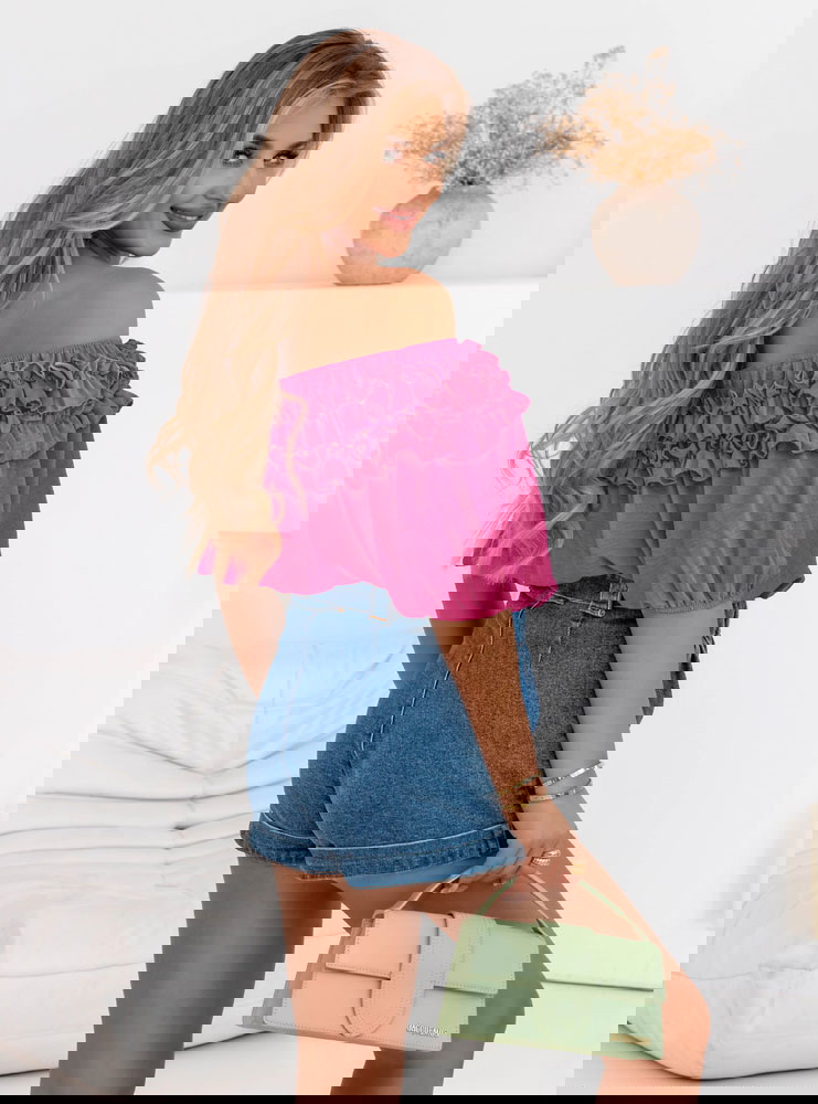 Różowa bluzka hiszpanka z falbankami Elicja to propozycja pełna wdzięku, świeżości i pozytywnej energii. Jej intensywny kolor przyciąga uwagę i od razu poprawia nastrój. Odkryte ramiona dodają kobiecego uroku i lekkości, a falbanki w górnej części są subtelnym, ale efektownym detalem. To model, który sprawdzi się świetnie w codziennych stylizacjach – zarówno w mieście, jak i na wakacjach. Bluzka jest luźna, wygodna i bardzo przyjemna w noszeniu, dzięki czemu sprawdzi się w cieplejsze dni. Styl hiszpanki to nieprzemijająca klasyka, która zawsze wygląda stylowo. Kolor różowy idealnie komponuje się z opalenizną, ale także pięknie kontrastuje z klasycznymi jeansami. To model, który możesz wystylizować na wiele sposobów – romantycznie, casualowo lub bardziej nowocześnie. Bluzka dodaje dziewczęcego uroku bez przesady – jest kobieca, świeża i bardzo stylowa. Jeśli lubisz styl z nutką flirtu i energii – ta bluzka spełni Twoje oczekiwania.