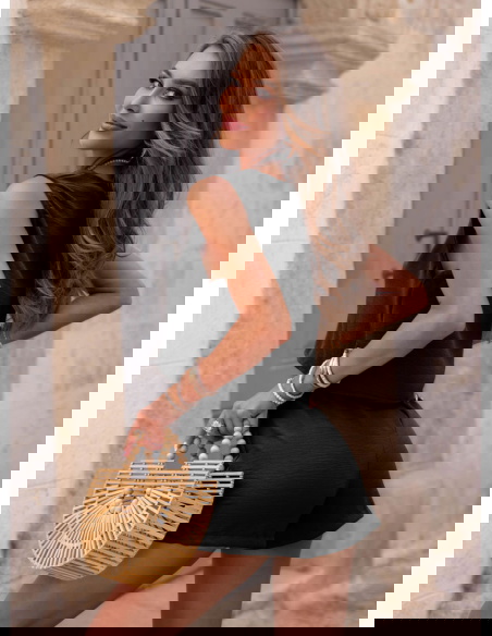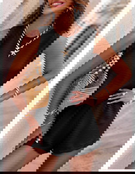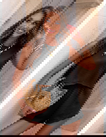 Czarny komplet top i spodenki Romilda to świetny wybór na wakacje – sprawdzi się na plażę, spacery po deptaku, zwiedzanie czy letni lunch z przyjaciółkami. Jest także idealny na weekendowe wypady za miasto.