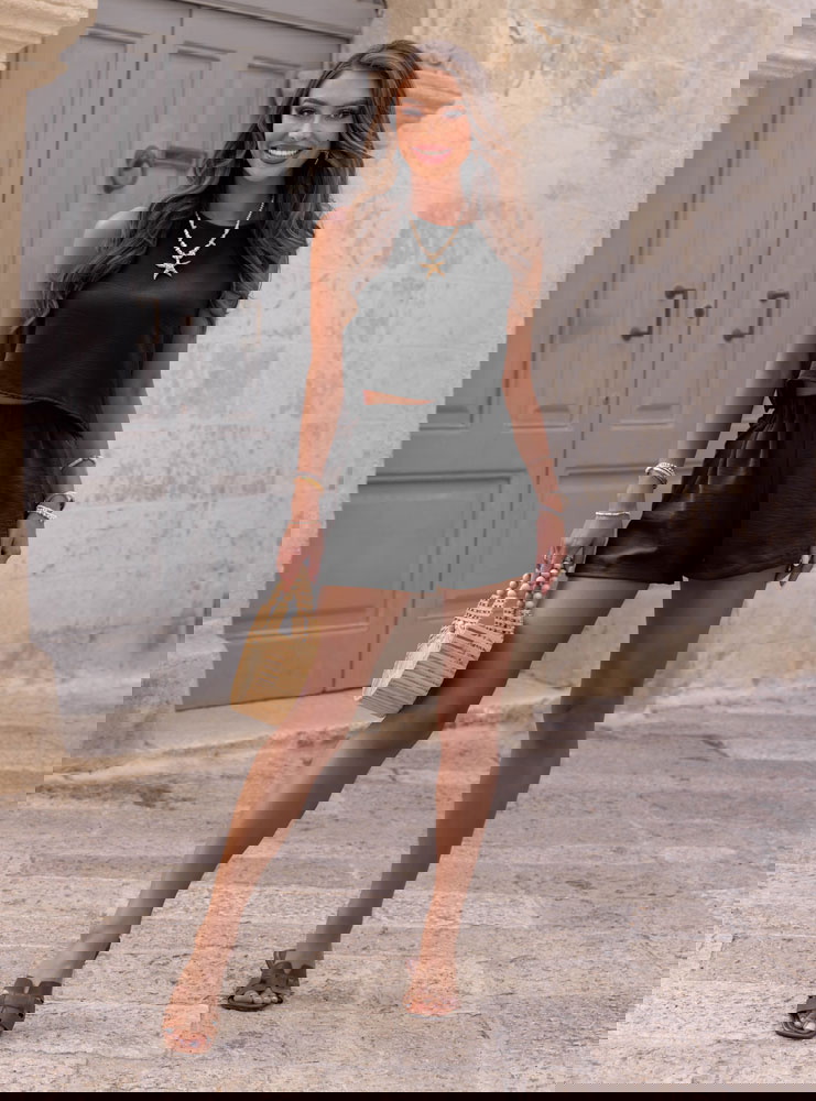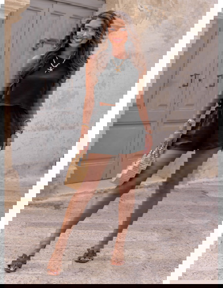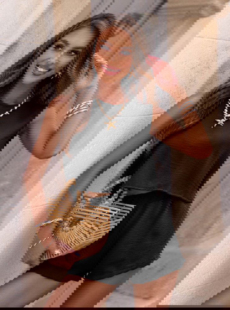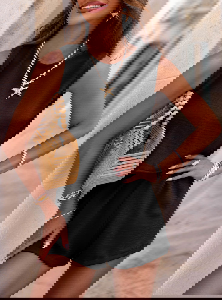 Czarny komplet top i spodenki Romilda to kwintesencja letniego stylu i wygody. To zestaw, który sprawdzi się zarówno podczas wakacyjnych spacerów nad morzem, jak i w miejskim klimacie. Minimalistyczny krój i uniwersalny kolor sprawiają, że ten komplet jest absolutnym must-have w letniej garderobie. Góra to klasyczny, prosty top bez rękawów, który pięknie eksponuje ramiona, a dół stanowią luźne szorty z elastyczną talią – idealne na upalne dni. Materiał delikatnie się układa, nadając całości lekkości. Ten komplet to doskonała baza, którą możesz stylizować na wiele sposobów – z klapkami, sandałkami, wiklinową torebką czy biżuterią w stylu boho. Wystarczy kilka dodatków, by uzyskać look jak z wakacyjnego kurortu. To zestaw, w którym będziesz wyglądać stylowo bez żadnego wysiłku.