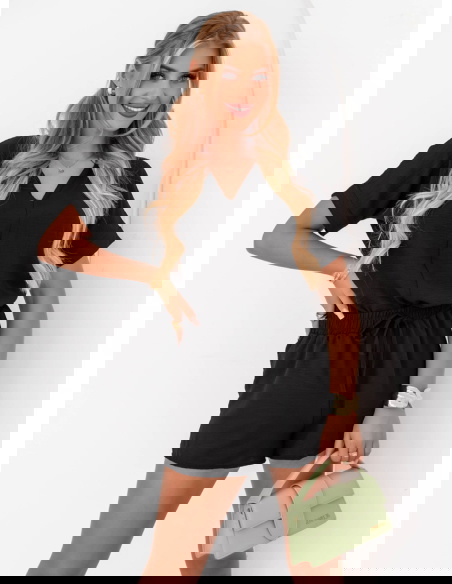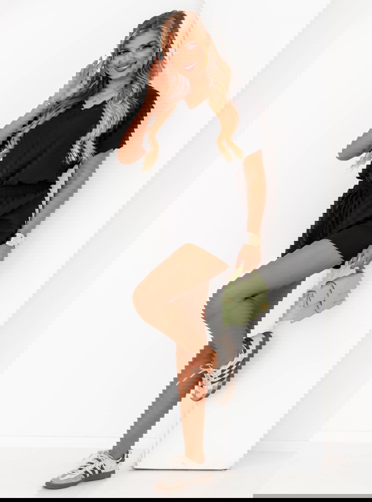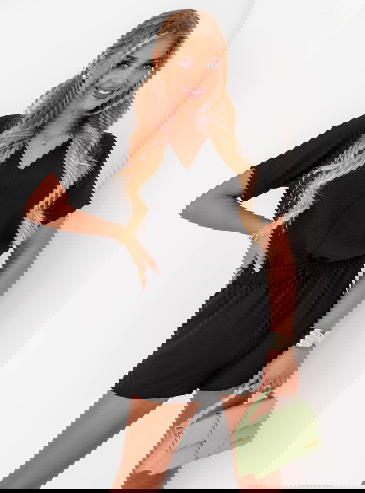 Czarny komplet bluzka + spodenki Majoriee to stylowa odpowiedź na potrzeby nowoczesnych kobiet, które cenią wygodę i modny wygląd w jednym. Ten zestaw to połączenie prostoty, uniwersalności i klasycznego koloru, który sprawdza się w każdej sytuacji. Luźna bluzka z dekoltem w literę V prezentuje się niezwykle lekko i kobieco, a przy tym nie krępuje ruchów. Spodenki z elastyczną talią i troczkiem zapewniają wygodę i świetnie dopasowują się do sylwetki. To komplet, który wygląda dobrze zarówno noszony razem, jak i jako baza do wielu innych stylizacji. Czerń dodaje elegancji i sprawia, że nawet luźniejszy fason prezentuje się bardzo stylowo. Całość daje efekt niewymuszonego szyku, który z łatwością dopasujesz do wielu okazji. Możesz wystylizować go bardziej casualowo lub dodać wyraziste dodatki, by uzyskać nowoczesny look. Jeśli lubisz ubrania, które są i wygodne, i efektowne – ten komplet z pewnością Ci się spodoba.