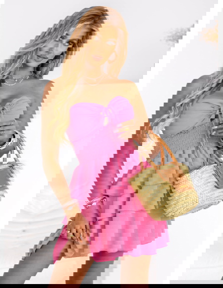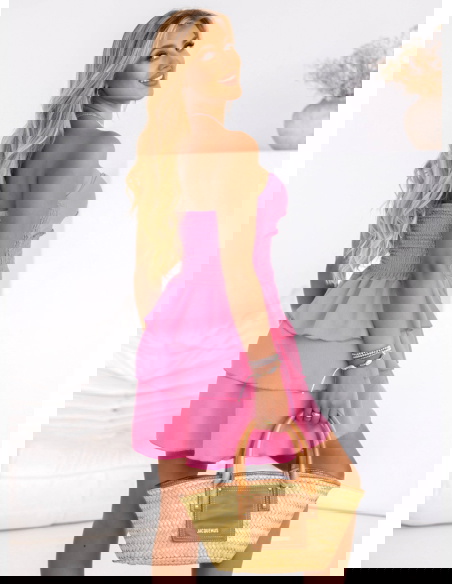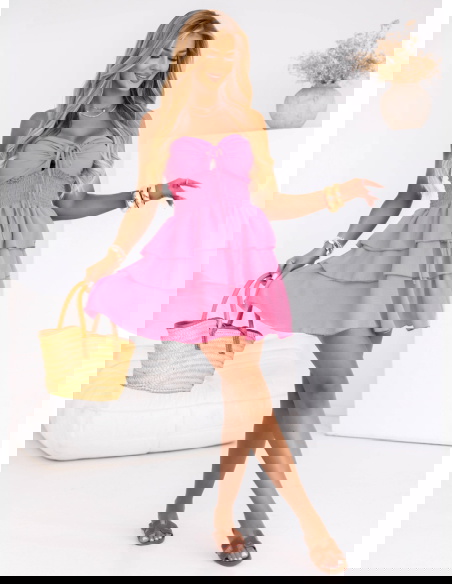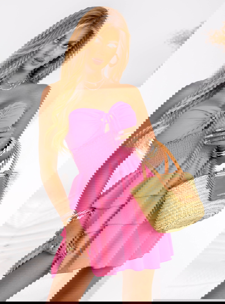 Różowa sukienka mini z falbanami Madeleina to kwintesencja letniej lekkości i dziewczęcego uroku. Jej intensywny, ale ciepły odcień różu natychmiast wprawia w dobry nastrój i przyciąga spojrzenia. Sukienka ma delikatnie dopasowaną górę z subtelnym wiązaniem na dekolcie, co pięknie podkreśla biust i ramiona. Elastyczny pas zapewnia komfort oraz podkreśla talię, tworząc zgrabną sylwetkę. Rozkloszowany, falbaniasty dół nadaje całej stylizacji lekkości i sprawia, że każdy krok wygląda niezwykle efektownie. To model, który porusza się razem z Tobą – kobieco i z klasą. Idealna do noszenia bez ramiączek, dzięki czemu sylwetka prezentuje się subtelnie i zmysłowo. Sukienka jest lekka, zwiewna i przyjemna do noszenia nawet w największe upały. To świetna opcja, kiedy chcesz wyglądać stylowo bez zbędnego wysiłku. Jeśli szukasz sukienki, w której poczujesz się swobodnie i wyjątkowo – ta będzie strzałem w dziesiątkę.