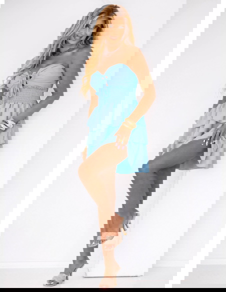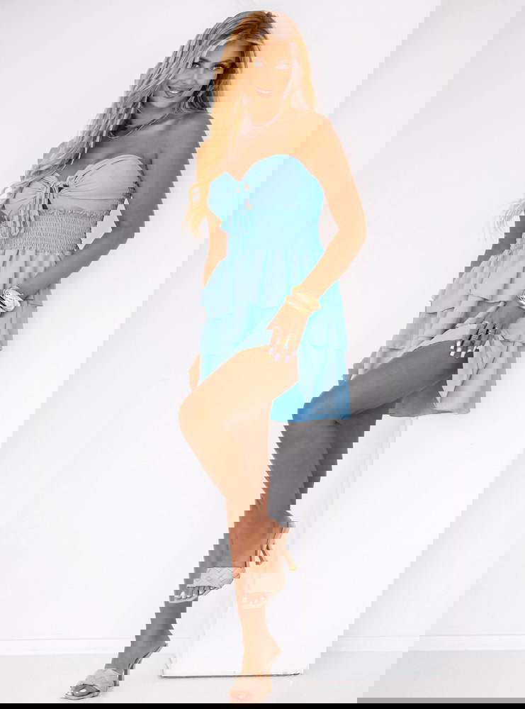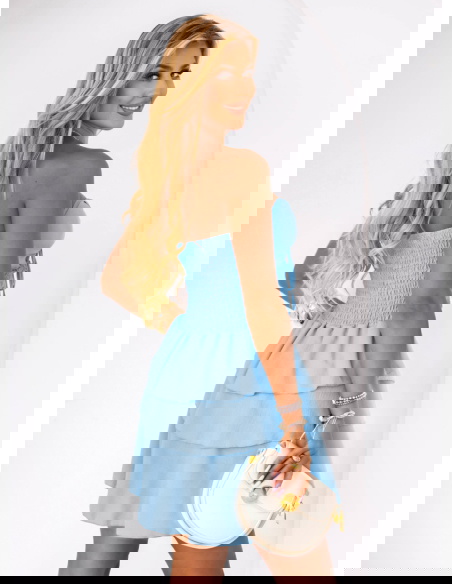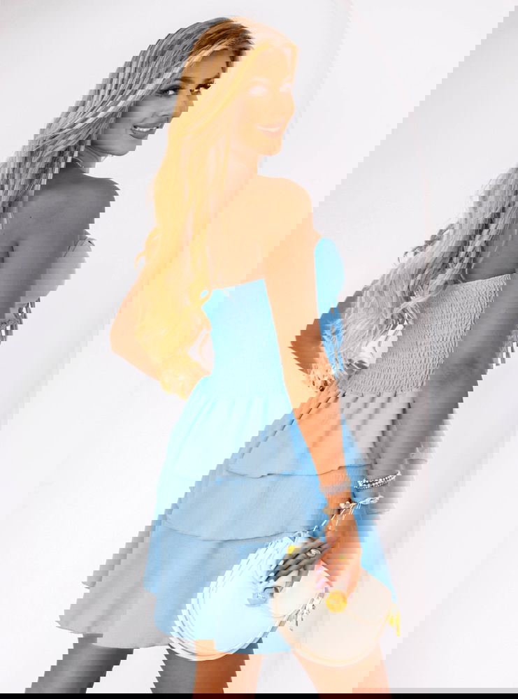 Błękitna sukienka mini z falbanami Madeleina to idealny wybór na letnie spacery, wakacyjne wyjazdy, a także spotkania z przyjaciółkami. Świetnie sprawdzi się zarówno podczas romantycznej kolacji, jak i na plażowej promenadzie.