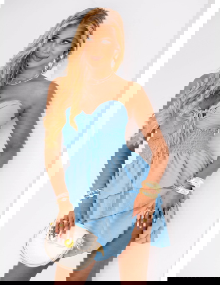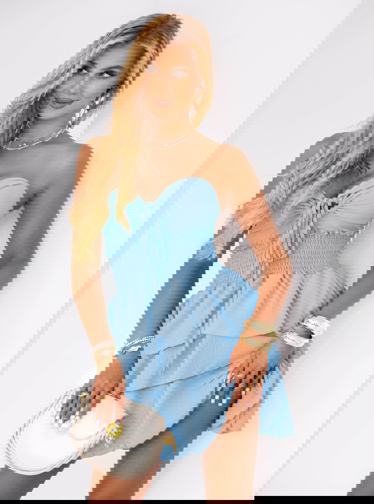 Błękitna sukienka mini z falbanami Madeleina to kwintesencja letniej kobiecości i lekkości. Od pierwszego spojrzenia zachwyca swoim urokiem i subtelnością. Jej delikatny kolor wprowadza powiew świeżości do każdej stylizacji. Falbany nadają jej wyjątkowego, romantycznego charakteru. Góra z marszczeniem podkreśla sylwetkę i nadaje całości dziewczęcego wdzięku. To sukienka, która przyciąga spojrzenia i dodaje pewności siebie. Sprawia, że każda kobieta czuje się w niej swobodnie, ale i wyjątkowo. Błękit pięknie współgra z opaloną skórą, a fason z odkrytymi ramionami podkreśla letni klimat. To idealna propozycja dla kobiet, które lubią czuć się pięknie i komfortowo zarazem. Jeśli szukasz sukienki na lato, która będzie uniwersalna i efektowna – właśnie ją znalazłaś!