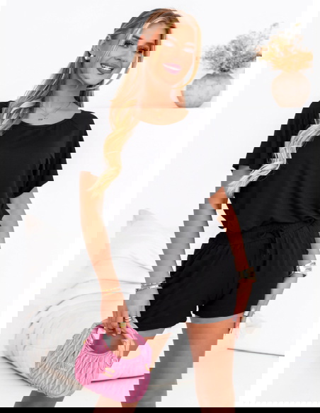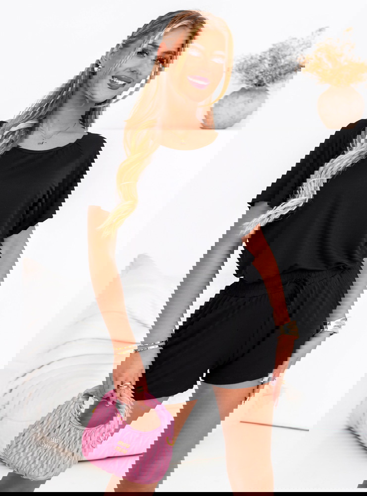 Czarny komplet bluzka i spodenki Davynn świetnie nadaje się do noszenia na co dzień – do miasta, na zakupy lub spotkanie z przyjaciółmi. Dzięki swojej wygodzie będzie idealnym rozwiązaniem na weekendowe wypady, wycieczki lub spacery.