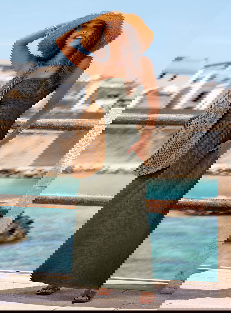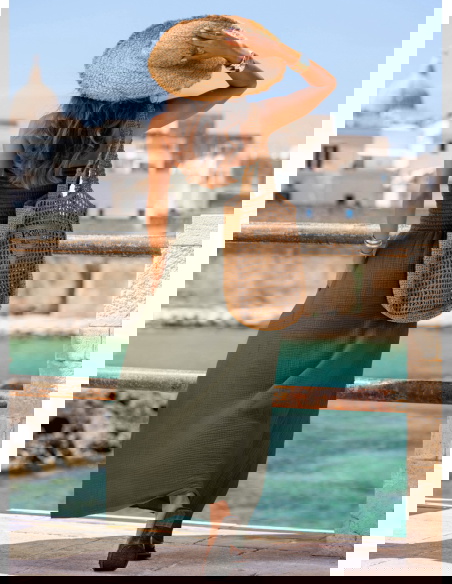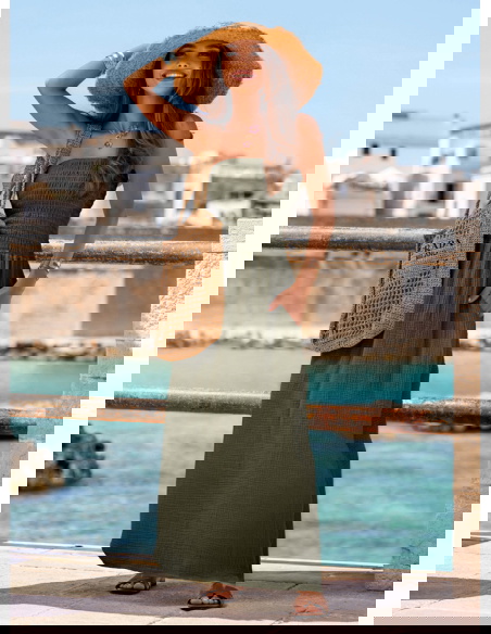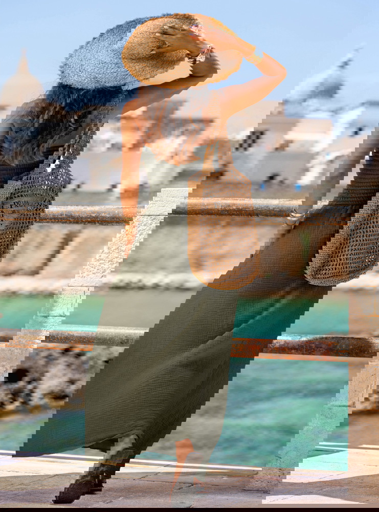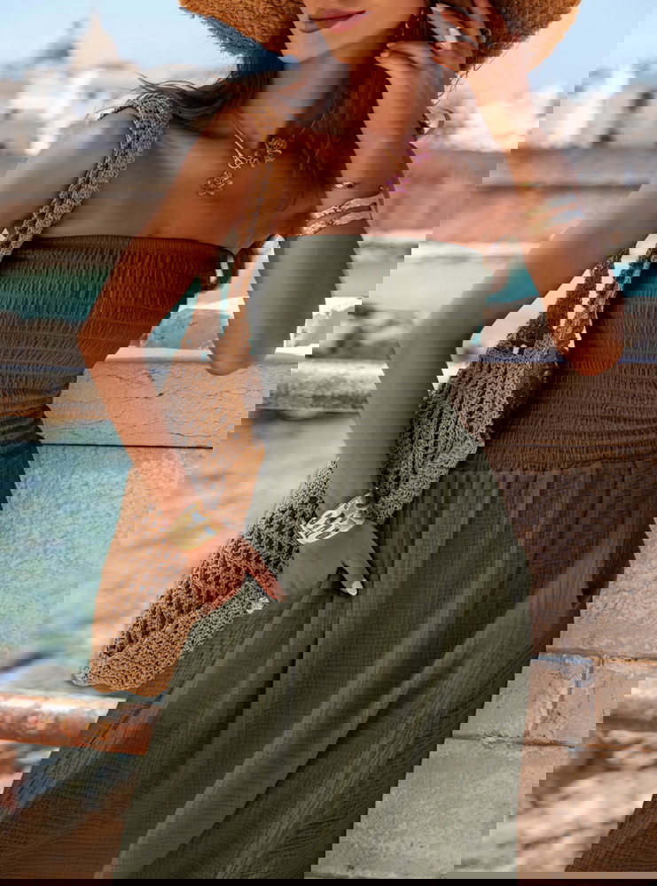 Muślinowa długa sukienka bez ramiączek Federicaa - khaki to must-have w wakacyjnej garderobie każdej kobiety. Jej fason i długość sprawiają, że jest niezwykle uniwersalna i pasuje do wielu sylwetek.