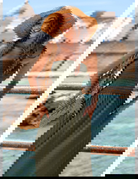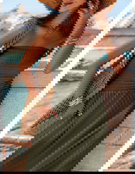 Muślinowa długa sukienka bez ramiączek Federicaa - khaki to kwintesencja letniego luzu i kobiecego uroku. Jej swobodny krój i uniwersalny kolor sprawiają, że trudno przejść obok niej obojętnie. To model, który pokochasz za wygodę i za to, jak pięknie układa się na sylwetce. Sukienka łączy w sobie modny minimalizm i romantyczny klimat. Dzięki swojej długości dodaje elegancji, ale pozostaje przy tym lekka i przyjazna dla codziennego noszenia. Kolor khaki świetnie wpisuje się w naturalne, letnie otoczenie – pasuje zarówno na plażę, jak i do miejskiej dżungli. Brak ramiączek eksponuje ramiona i dekolt, podkreślając letnią opaleniznę. To propozycja dla kobiet, które cenią sobie styl z nutą nonszalancji. Sukienka pozwala poczuć się swobodnie, ale wciąż wyjątkowo. Wystarczy kilka dodatków, by zmienić jej charakter – od totalnie casualowego po bardziej szykowny.