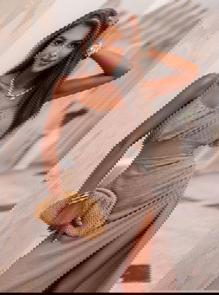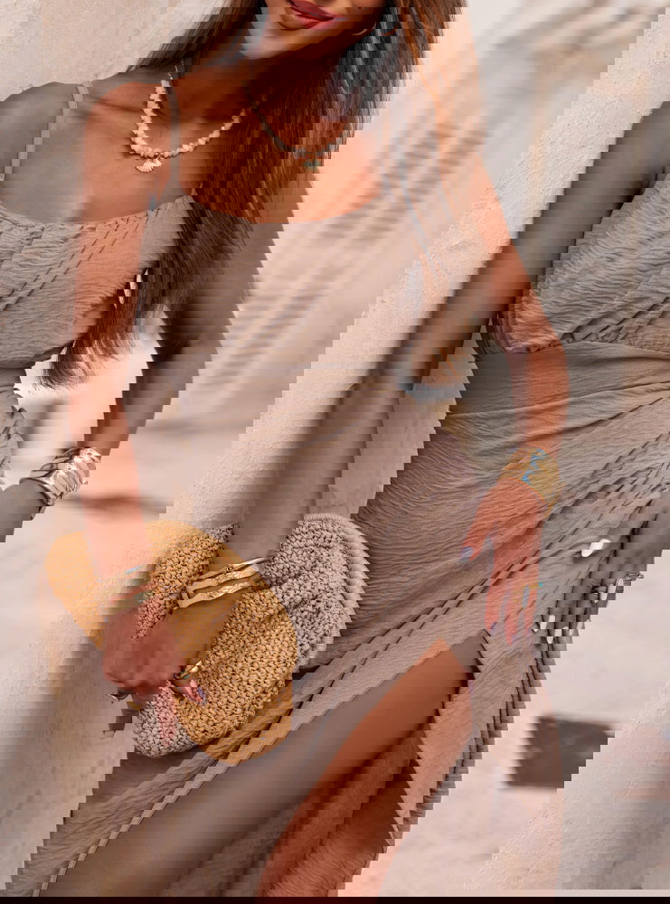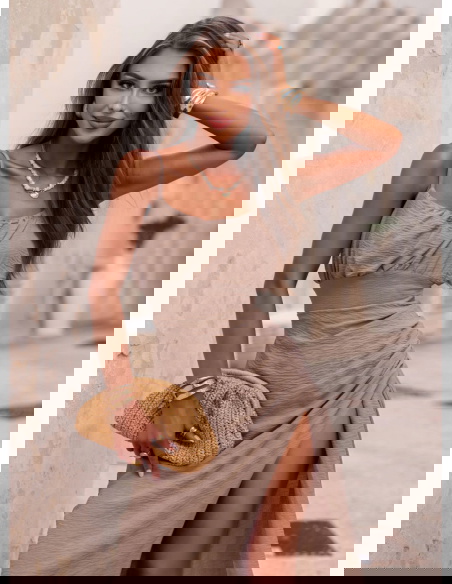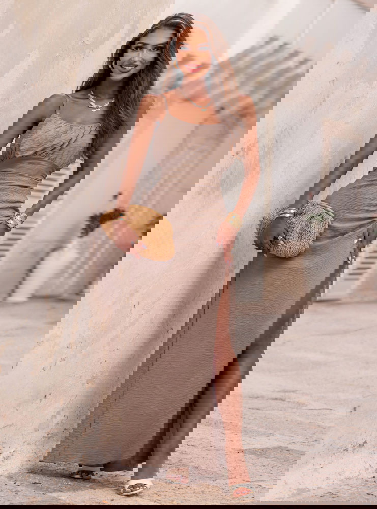Długa sukienka na ramiączkach z rozcięciem Agape - mocha mousse to must-have w letniej garderobie. Jej zmysłowy krój i kobiecy charakter przyciągają uwagę bez zbędnego przepychu.