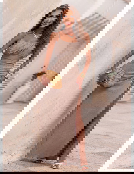 Długa sukienka na ramiączkach z rozcięciem Agape - mocha mousse
