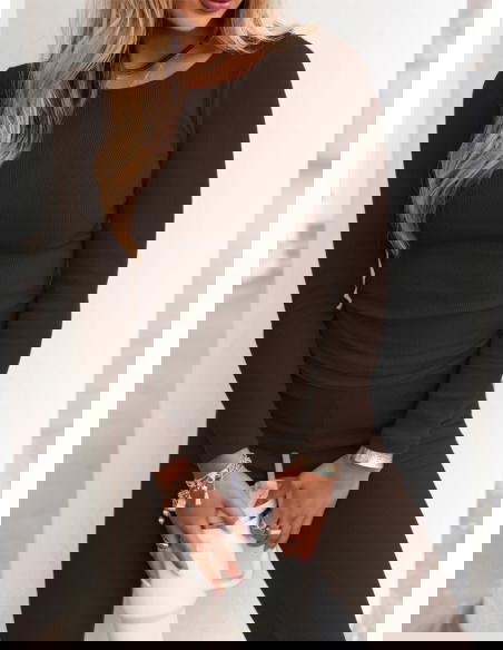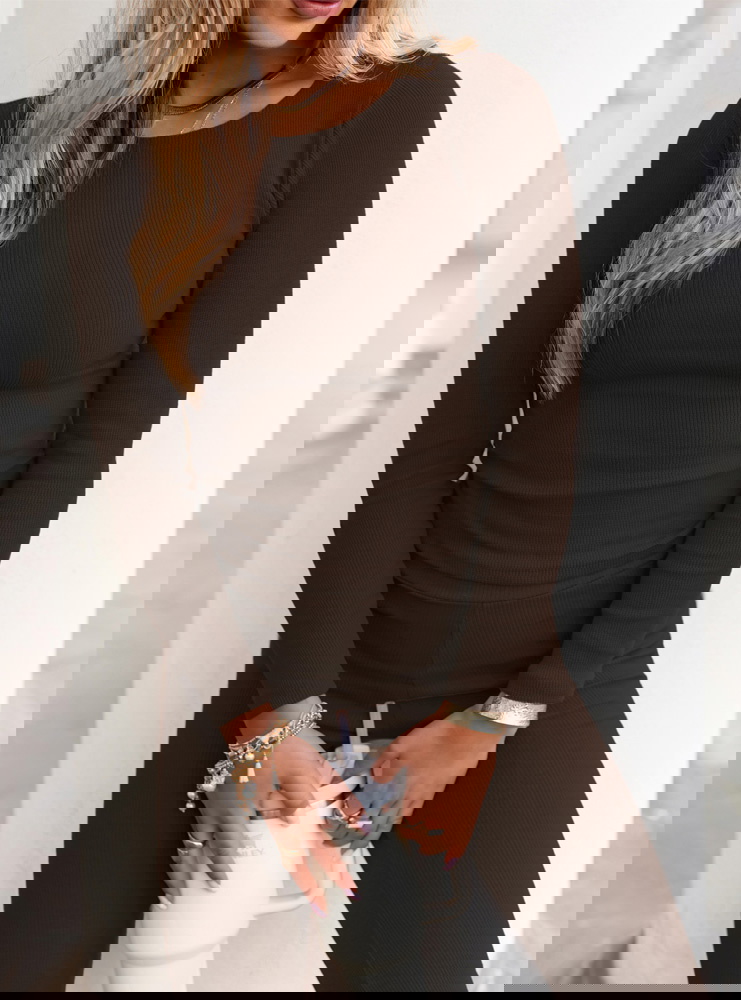 Czekoladowy prążkowany komplet dopasowana bluzka i spodnie Dyanna