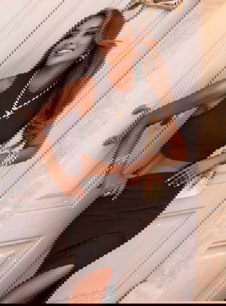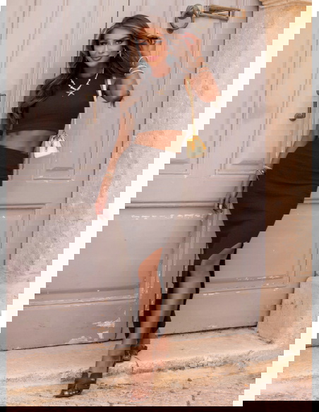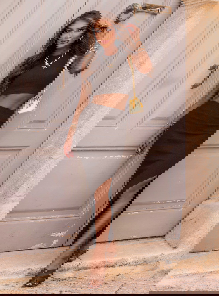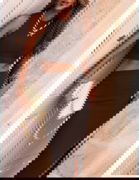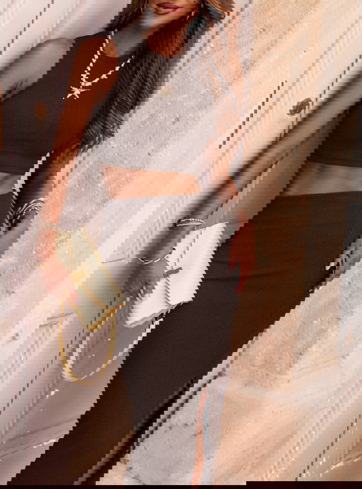 Czekoladowy prążkowany komplet top i spódnica z rozcięciem Vanya