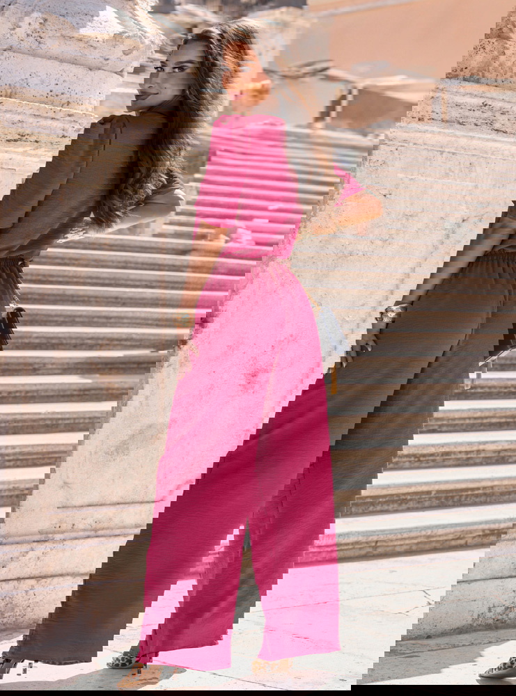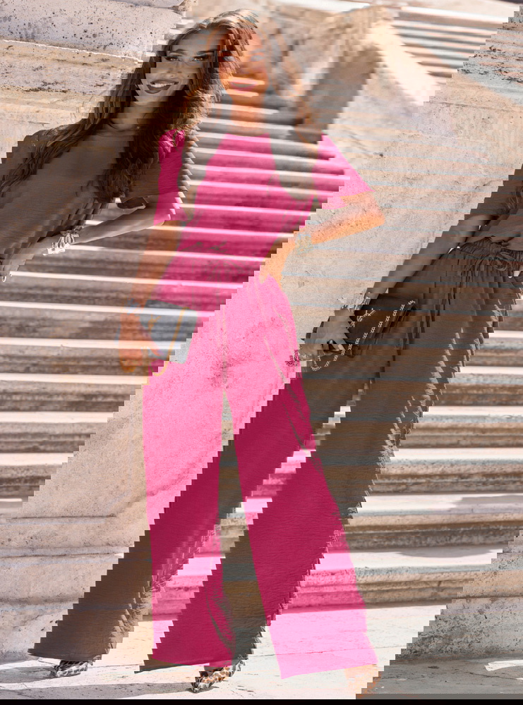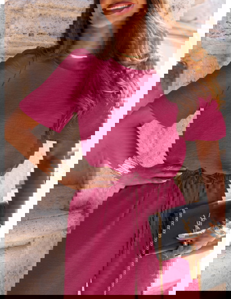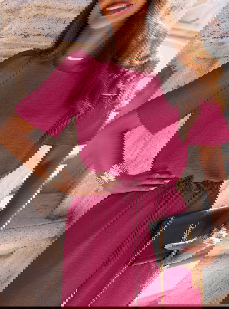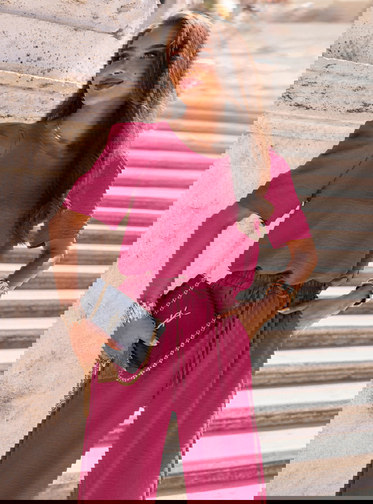 Komplet bluzka i szerokie spodnie Mascia - fuksja to kwintesencja kobiecości w energetycznym, wyrazistym wydaniu. Ten zestaw przyciąga spojrzenia od pierwszej chwili i pozwala poczuć się pewnie, bez względu na okazję. Kolor fuksji dodaje stylizacji charakteru, a jednocześnie świetnie współgra z letnim i wczesnojesiennym klimatem. Krój kompletu jest swobodny, ale niepozbawiony elegancji – to idealne połączenie luzu i klasy. Bluzka z krótkim rękawem i spodnie z szerokimi nogawkami tworzą stylową całość, która sprawdzi się zarówno w ruchu, jak i w bardziej statycznych sytuacjach. Elastyczna talia ze ściągaczem nie tylko zwiększa komfort noszenia, ale również subtelnie podkreśla talię. Całość prezentuje się niezwykle lekko i nowocześnie, dając wiele możliwości stylizacyjnych. To jeden z tych modeli, które wyglądają dobrze bez wysiłku i idealnie wpisują się w klimat kolekcji Prefall – gotowej na zmieniające się pory roku. Zestaw, który nie tylko wygląda efektownie, ale też sprawia, że czujesz się w nim swobodnie i kobieco. Jeśli szukasz czegoś odważnego, ale wciąż eleganckiego – to komplet, który zasługuje na miejsce w Twojej szafie.