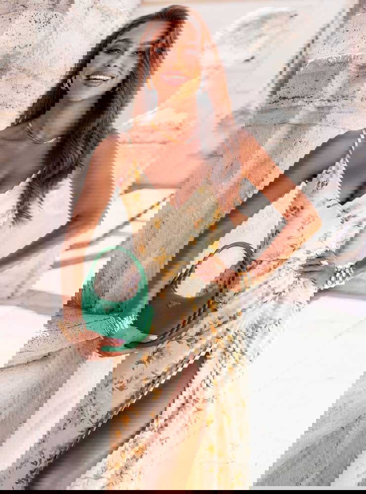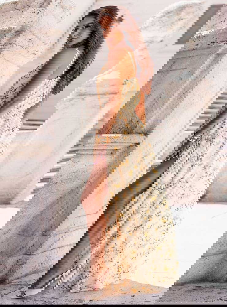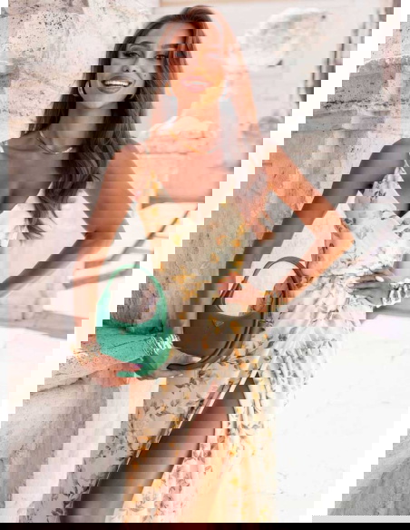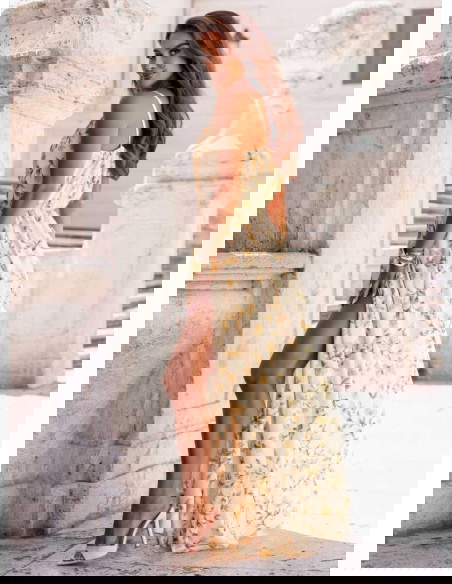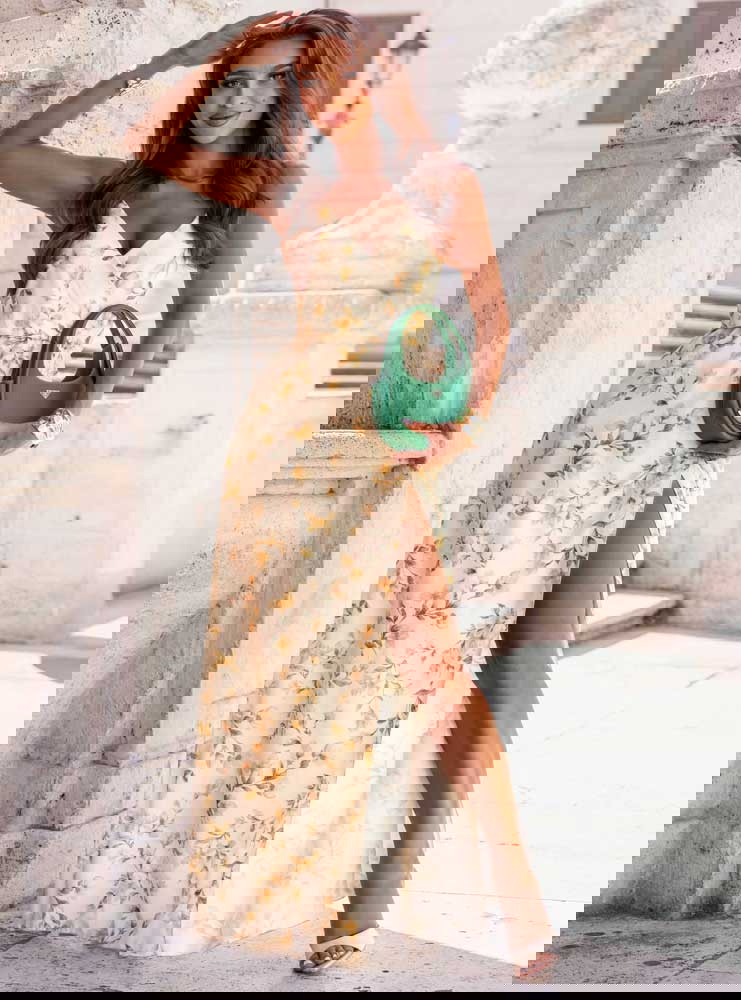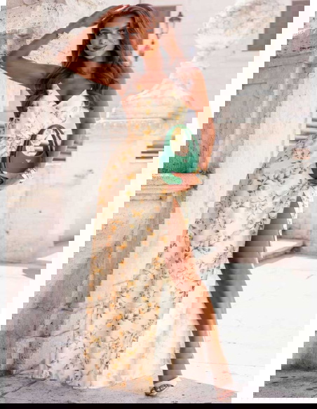 Długa wzorzysta sukienka na ramiączkach z rozcięciem Euridice - R17 to esencja kobiecego wdzięku w letnim wydaniu. Zjawiskowy krój sprawia, że trudno przejść obok niej obojętnie. Delikatne ramiączka, podkreślający dekolt i lekki materiał układają się na sylwetce z niesamowitą lekkością. Wzór w żółte kwiaty przywołuje skojarzenia z ciepłymi, słonecznymi dniami i romantyczną atmosferą wakacyjnych spacerów. Subtelne rozcięcie z boku dodaje całości zmysłowego charakteru, nie rezygnując przy tym z elegancji. Sukienka łączy w sobie wszystko to, co kobiety kochają w letnich stylizacjach – lekkość, swobodę ruchów i klasę. Ten model zachwyca swoją formą – wydłuża sylwetkę, delikatnie eksponuje nogę i pięknie podkreśla talię. To sukienka, która sprawia, że od razu czujesz się wyjątkowo – nawet bez dodatkowych stylizacji. Dzięki swojej subtelnej kolorystyce łatwo łączy się z różnymi dodatkami, tworząc spójne i efektowne looki. Jeśli marzysz o kreacji, w której zachwycisz nie tylko na zdjęciach, ale też w rzeczywistości – właśnie ją znalazłaś.