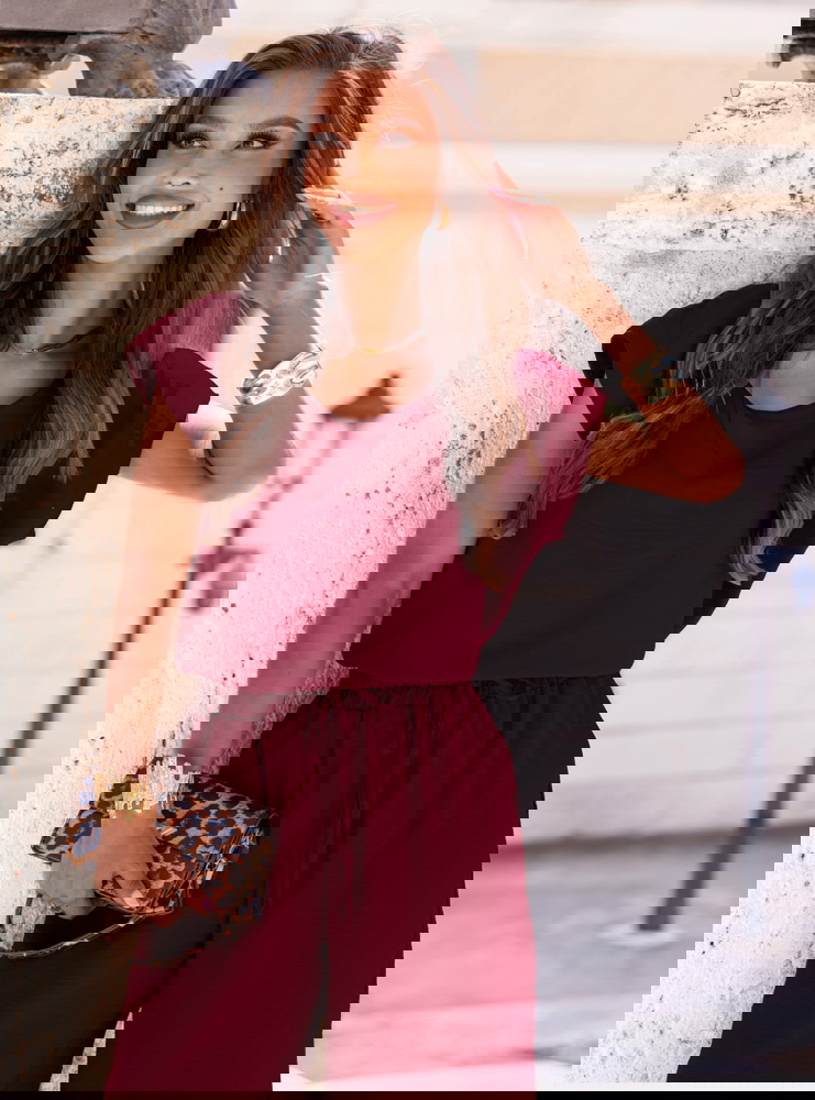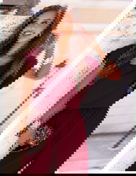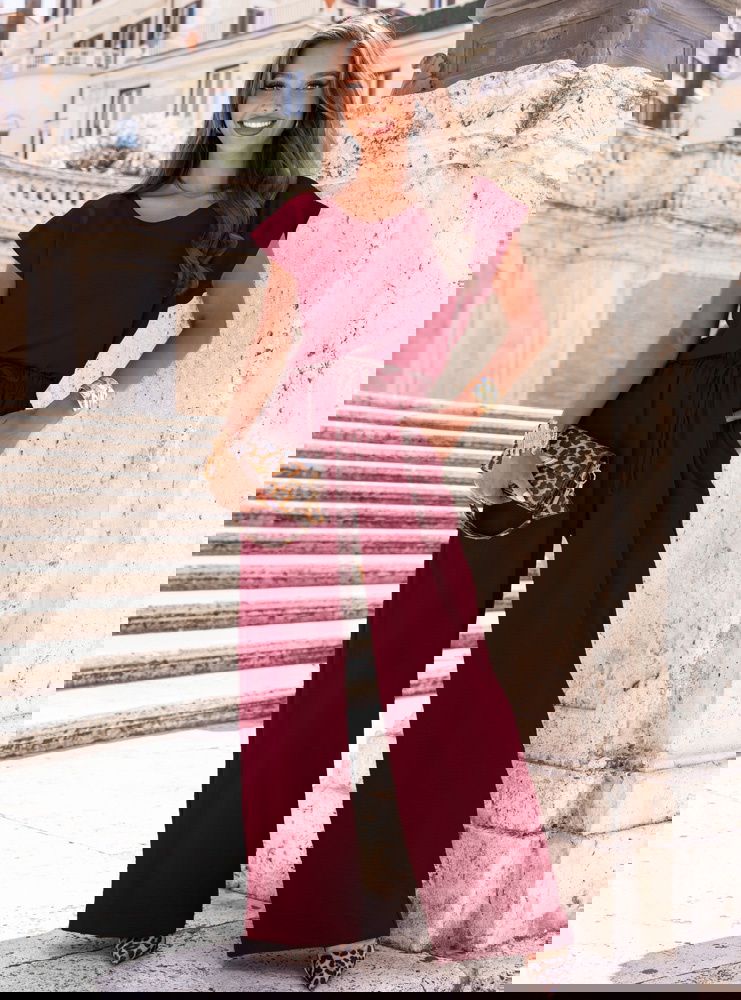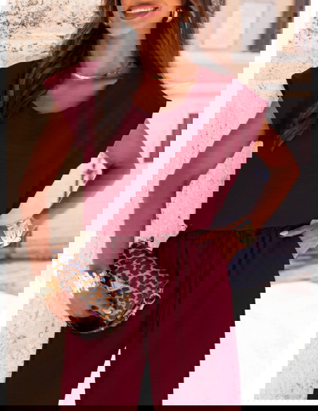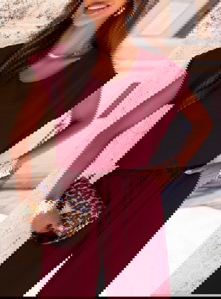 Bordowy komplet bluzka z krótkim rękawem i spodnie Nunziaa to stylowy wybór dla kobiet, które lubią wyglądać elegancko, nie rezygnując przy tym z wygody. Ten zestaw przyciąga uwagę intensywnym kolorem, który pięknie podkreśla urodę i dodaje klasy każdej stylizacji. Bordo to odcień z charakterem – idealny dla kobiet, które cenią subtelną elegancję z nutą pewności siebie. Komplet wyróżnia się prostotą kroju, dzięki czemu prezentuje się bardzo nowocześnie i lekko. Szerokie spodnie świetnie układają się w ruchu i dodają sylwetce lekkości. Bluzka z krótkim rękawem delikatnie opada na ramiona, tworząc zrównoważony, kobiecy look. To zestaw, który wygląda świetnie zarówno solo, jak i w towarzystwie wyrazistych dodatków. Idealnie sprawdzi się w cieplejsze dni, ale równie dobrze odnajdzie się w stylizacjach warstwowych. Dobrze wygląda na różnych typach sylwetki i daje dużo swobody w codziennym użytkowaniu. Ten komplet to dowód na to, że moda może być wygodna i efektowna jednocześnie.