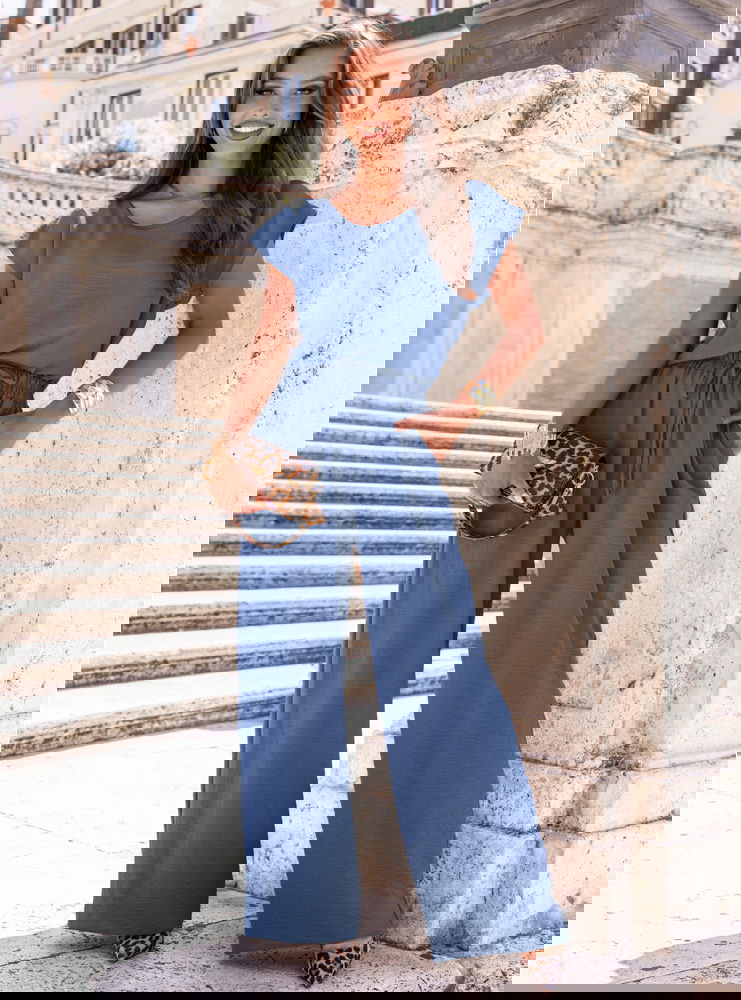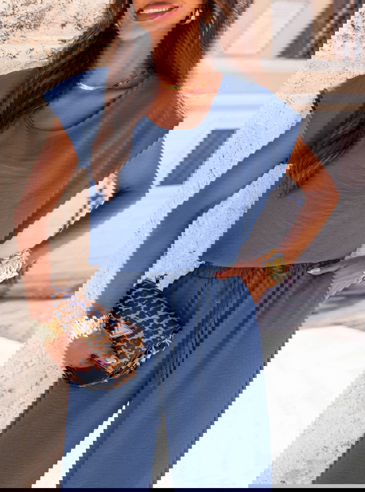 Komplet bluzka z krótkim rękawem i spodnie Nunziaa - jeans to wyjątkowo stylowa i wygodna propozycja na każdy dzień. Jego swobodny krój pozwala na pełną swobodę ruchów, a kolor w odcieniu jeans dodaje nowoczesnego, miejskiego charakteru. To zestaw, który idealnie wpisuje się w aktualne trendy, nie rezygnując z klasycznej elegancji. Bluzka z krótkim rękawem doskonale układa się na sylwetce, a szerokie spodnie pięknie ją równoważą. Dzięki elastycznemu pasowi i wiązaniu w talii, spodnie świetnie dopasowują się do figury. Ten komplet daje ogromne możliwości stylizacyjne – możesz go nosić jako całość lub miksować z innymi ubraniami z szafy. Idealny do noszenia zarówno w codziennym pośpiechu, jak i podczas spokojniejszych dni. To zestaw, który sprawdzi się w różnych okolicznościach, niezależnie od pory roku. Wystarczy dodać ulubioną torebkę, buty i biżuterię – i gotowe! W prostocie tego kompletu kryje się jego największa siła – styl, komfort i uniwersalność w jednym.