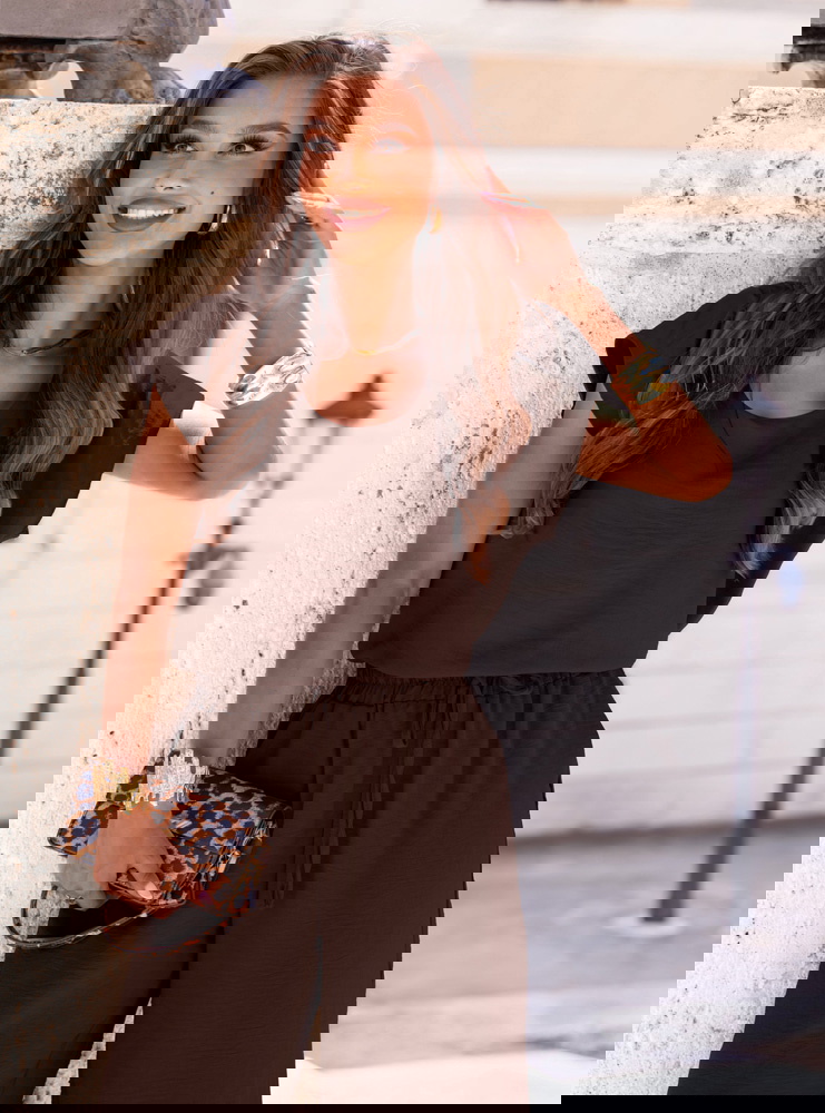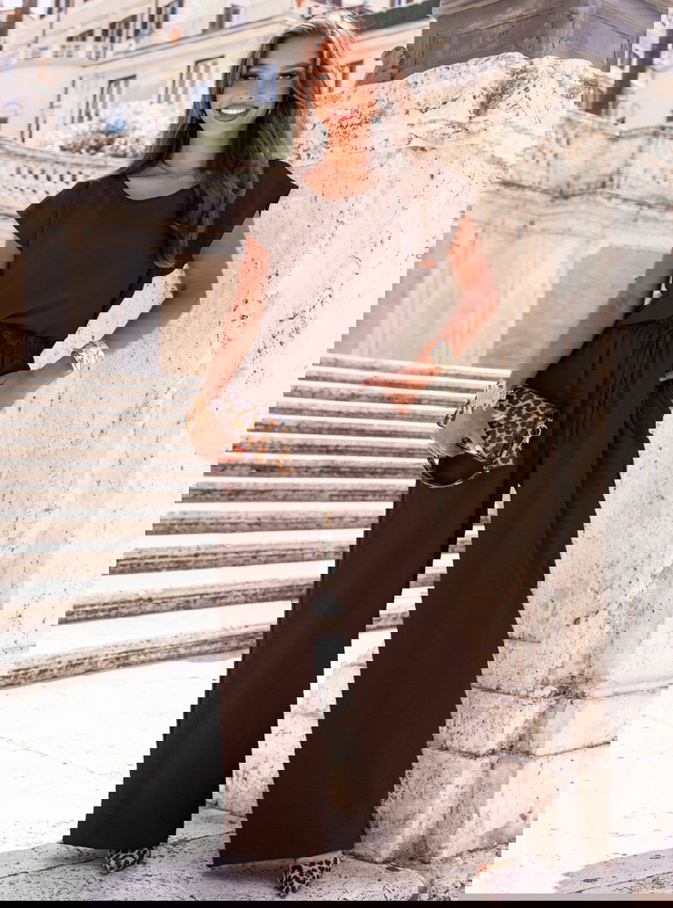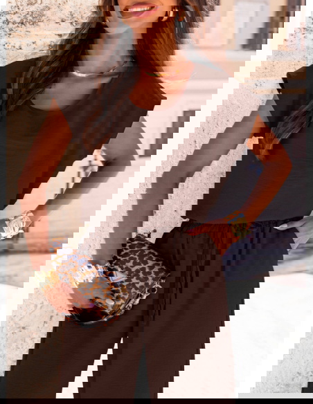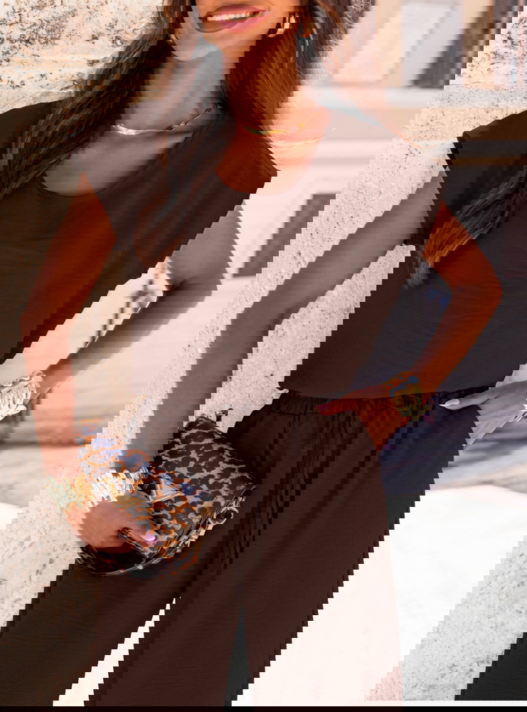 Czekoladowy komplet bluzka z krótkim rękawem i spodnie Nunziaa to stylowa odpowiedź na potrzeby współczesnej kobiety, która chce wyglądać dobrze, a jednocześnie czuć się swobodnie. Głęboki, czekoladowy odcień dodaje elegancji i przyciąga wzrok swoją oryginalnością – to idealna alternatywa dla klasycznej czerni czy beżu. Luźna bluzka z krótkim rękawem doskonale układa się na sylwetce, a przy tym jest bardzo wygodna i przewiewna. Spodnie z wysokim stanem, szerokimi nogawkami i wiązaniem w talii pięknie podkreślają figurę i nadają całemu zestawowi nowoczesnego szyku. To komplet, który świetnie sprawdzi się nie tylko na co dzień, ale też w bardziej eleganckiej wersji – wystarczy dodać odpowiednie dodatki. Całość wygląda spójnie i bardzo kobieco, nie tracąc przy tym nic z lekkości. Taki zestaw to świetna baza do stylizacji na różne okazje, w których zależy Ci na naturalnym, ale zadbanym wyglądzie. Dzięki praktycznemu fasonowi i neutralnej kolorystyce, ten komplet łatwo dopasujesz do swojego stylu. Jeśli lubisz rzeczy, które są i modne, i praktyczne – ten model z pewnością przypadnie Ci do gustu. To stylizacja, która pracuje za Ciebie – wystarczy ją założyć, by wyglądać świetnie bez zbędnego kombinowania.