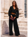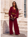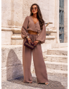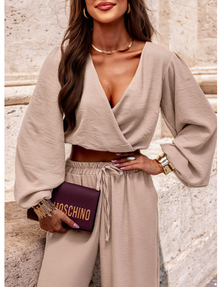 Beżowy komplet top z bufiastymi rękawami i długie spodnie Navis