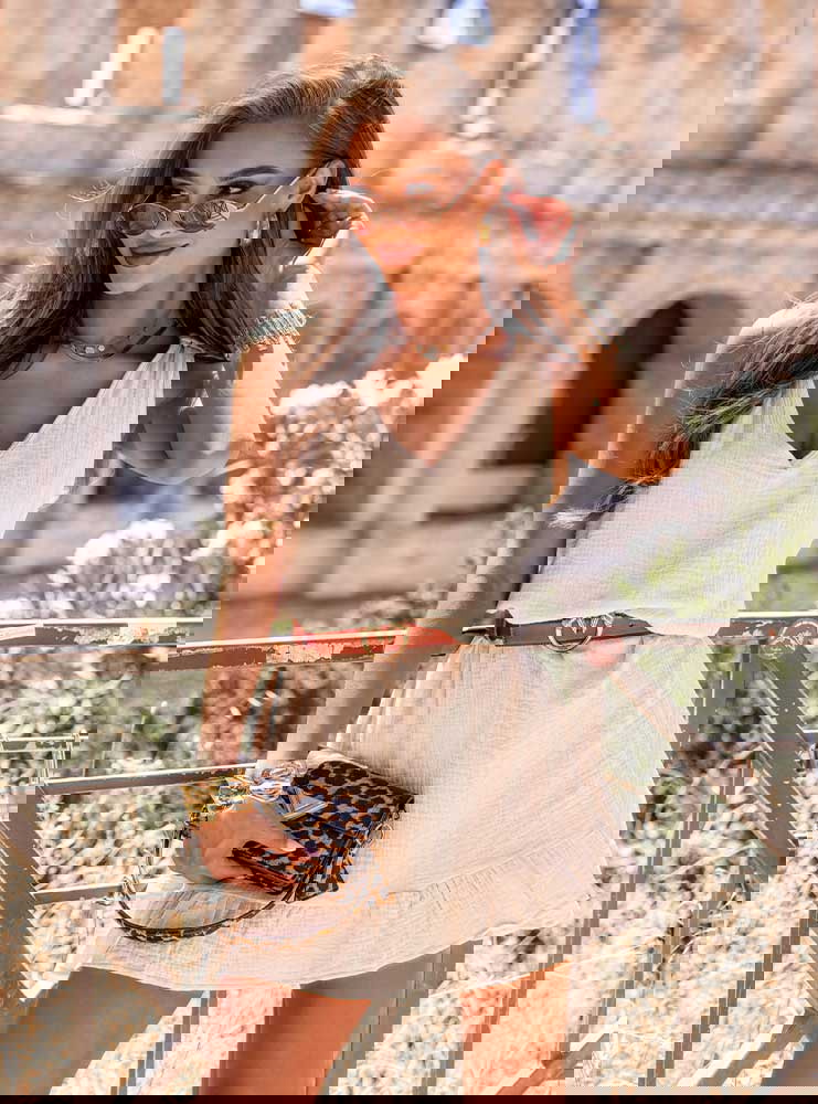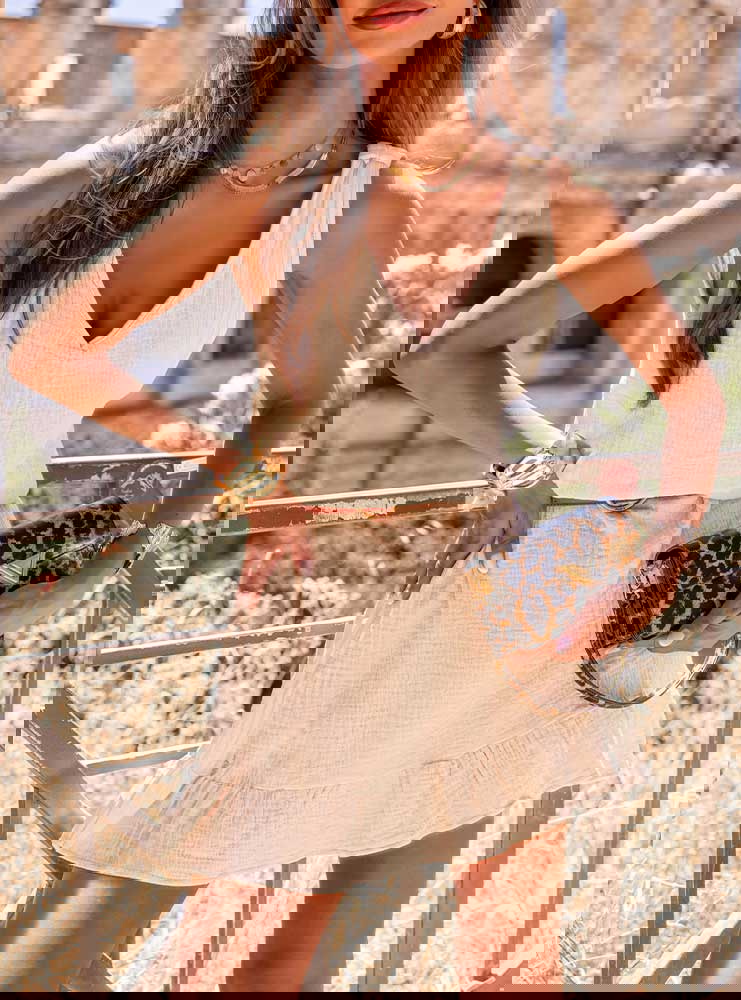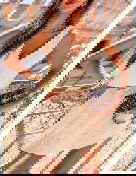 Beżowa muślinowa sukienka na ramiączkach Danayle to idealna propozycja dla miłośniczek delikatnych, zwiewnych fasonów i naturalnych odcieni. Subtelny beż pięknie podkreśla letnią opaleniznę i dodaje stylizacji ciepła oraz lekkości. Sukienka została zaprojektowana z myślą o komforcie – jej mocno rozkloszowany krój nie opina ciała, dając pełną swobodę ruchów. Dzięki temu świetnie sprawdzi się zarówno na co dzień, jak i podczas urlopowych wyjazdów. Ramiączka oraz dekolt w literę V nadają sylwetce lekkości i kobiecego wdzięku. Można nosić ją solo lub stylizować według własnych upodobań – na przykład z paskiem, jak pokazano na zdjęciu (pasek nie jest w zestawie). W wersji bez paska sukienka wygląda równie efektownie – naturalnie, lekko i bardzo letnio. To propozycja, która nie narzuca się formą, a mimo to przyciąga wzrok. Doskonała dla kobiet, które lubią uniwersalne ubrania dające wiele możliwości stylizacyjnych. Niezależnie od dodatków, ten model zawsze będzie wyglądał świeżo i z klasą.