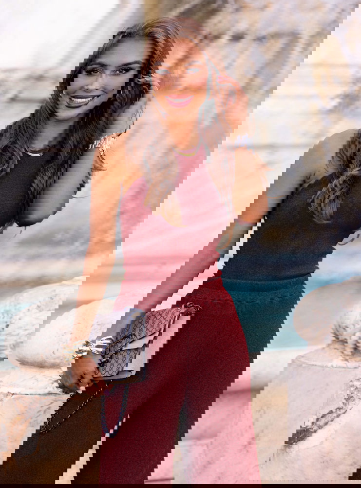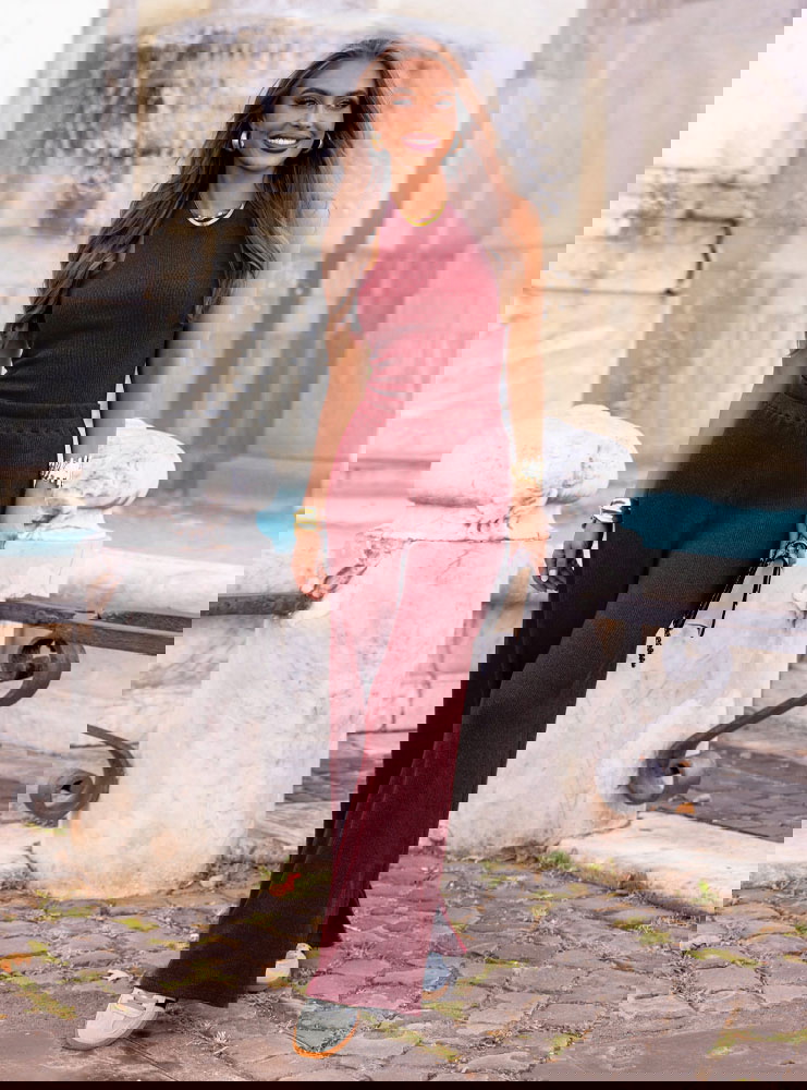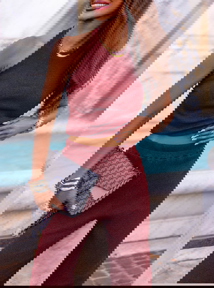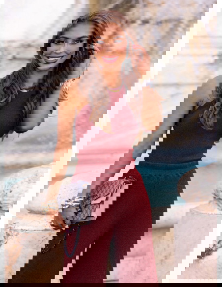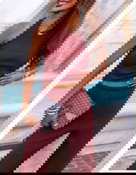 Bordowy prążkowany komplet top i spodnie Mironia sprawdzi się świetnie zarówno na co dzień, jak i podczas bardziej swobodnych spotkań – lunch w mieście, wypad na zakupy czy popołudniowy spacer. Można go też założyć na wieczorne wyjście, wystarczy zamienić buty na obcasy i dodać biżuterię.