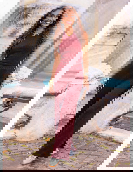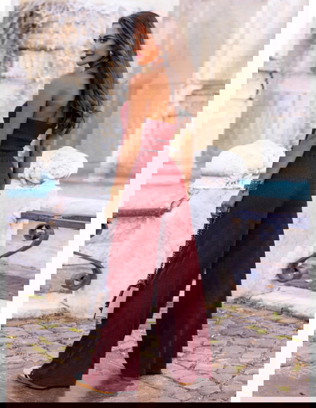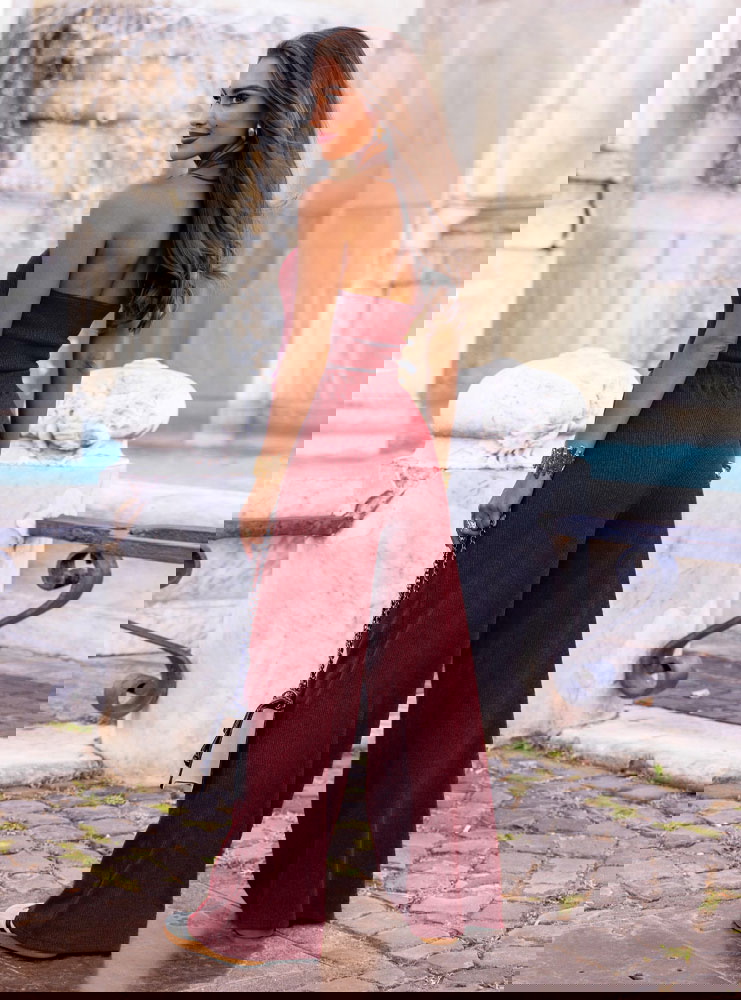 Bordowy prążkowany komplet top i spodnie Mironia to stylizacja, która perfekcyjnie łączy wygodę z wyrafinowaną prostotą. To zestaw dla kobiet, które lubią podkreślać swoją sylwetkę bez zbędnych ozdobników. Głęboki odcień bordo dodaje elegancji, a prążkowana struktura optycznie wysmukla figurę. Top typu halter pięknie eksponuje ramiona i szyję, tworząc nowoczesny, nieco sportowy, ale wciąż bardzo kobiecy charakter. Szerokie, długie spodnie z wysokim stanem świetnie równoważą proporcje sylwetki, wydłużając optycznie nogi. Całość wygląda nowocześnie, lekko i bardzo stylowo – to gotowy look, który nie potrzebuje wiele, by zachwycać. Idealny wybór, jeśli chcesz wyglądać z klasą, ale nieformalnie. Komplet możesz wystylizować zarówno na sportowo z sneakersami, jak i bardziej elegancko – z butami na obcasie i dodatkami. To doskonała baza do modnych, współczesnych stylizacji. Jeśli cenisz modę, która jest efektowna, ale nieprzekombinowana – ten komplet zdecydowanie przypadnie Ci do gustu.