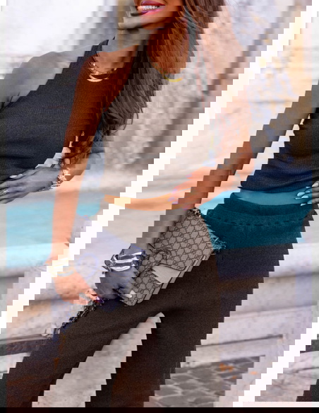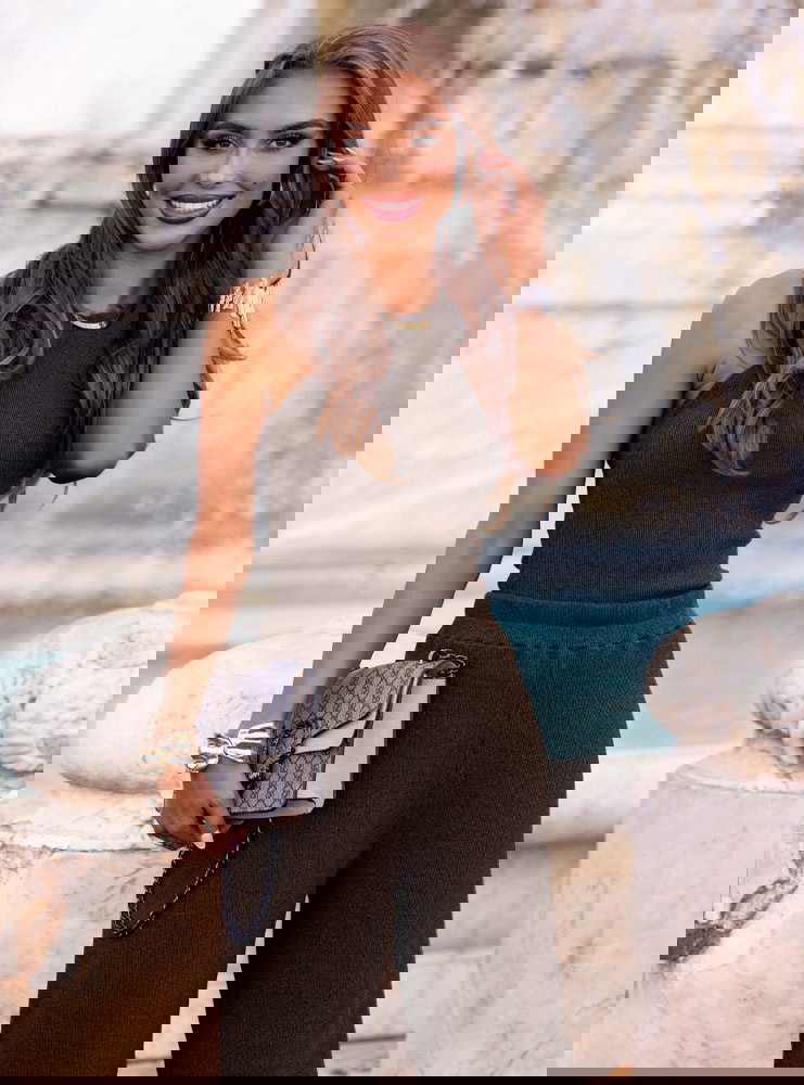 Czekoladowy prążkowany komplet top i spodnie Mironia to połączenie klasyki, nowoczesności i komfortu. Jego dopracowany fason podkreśla sylwetkę, a jednocześnie daje swobodę noszenia.