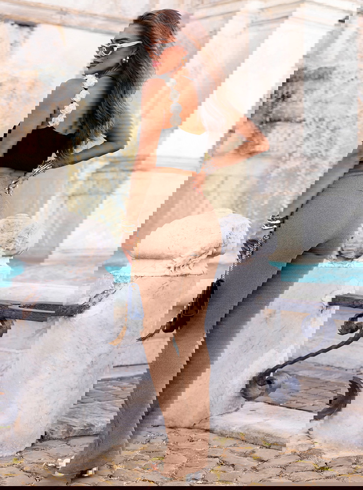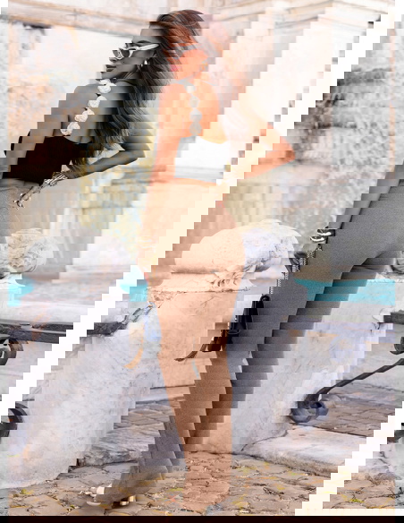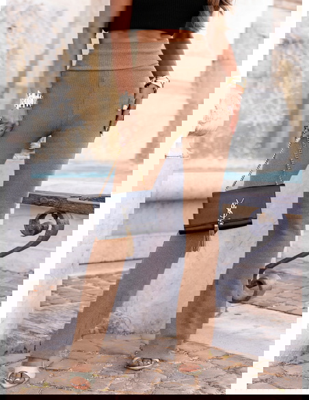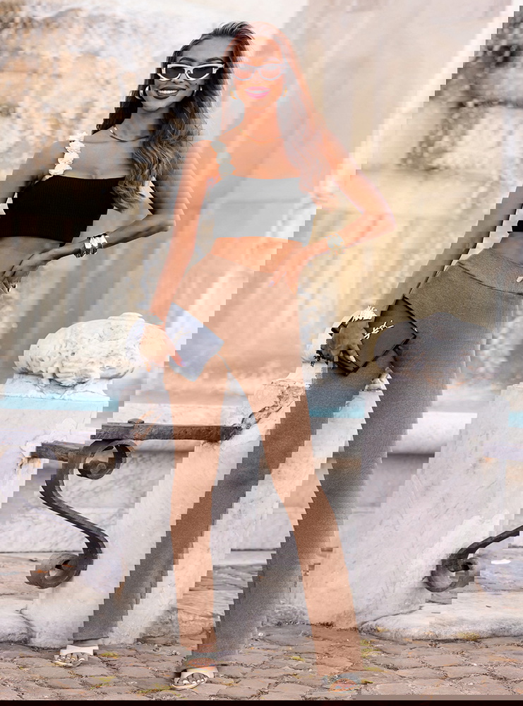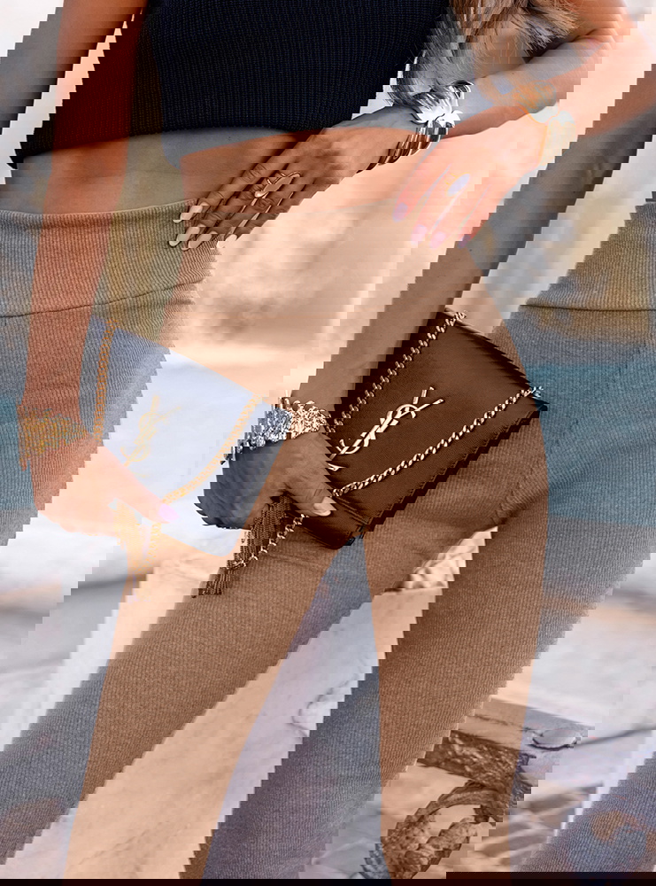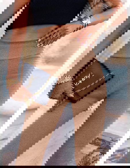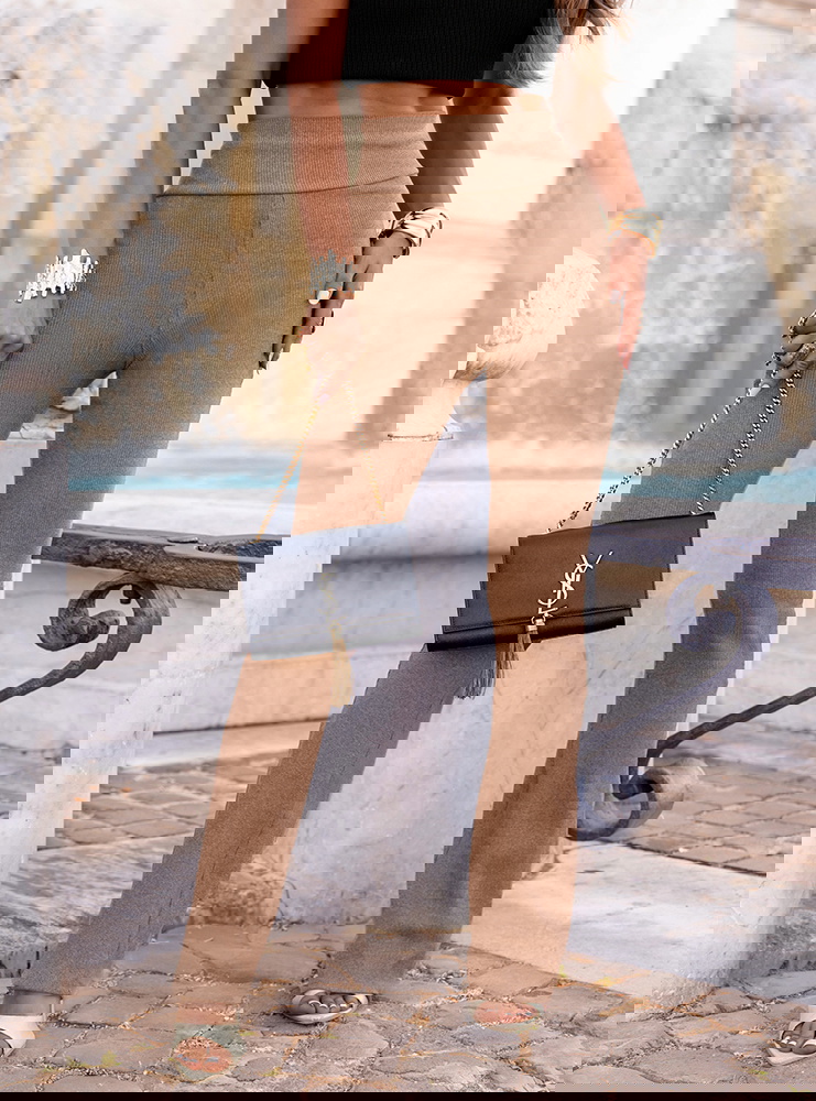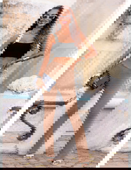 Czekoladowe prążkowane spodnie z rozszerzanymi nogawkami Trixie to połączenie wygody i modnego szyku. Wysoki stan i szeroki pas pięknie modelują sylwetkę, a lekko rozszerzany dół dodaje lekkiego, retro charakteru. Prążkowana tekstura w subtelny sposób wprowadza wakacyjny luz bez rezygnacji z elegancji. Elastyczna dzianina gwarantuje swobodę ruchu i komfort przez cały dzień.