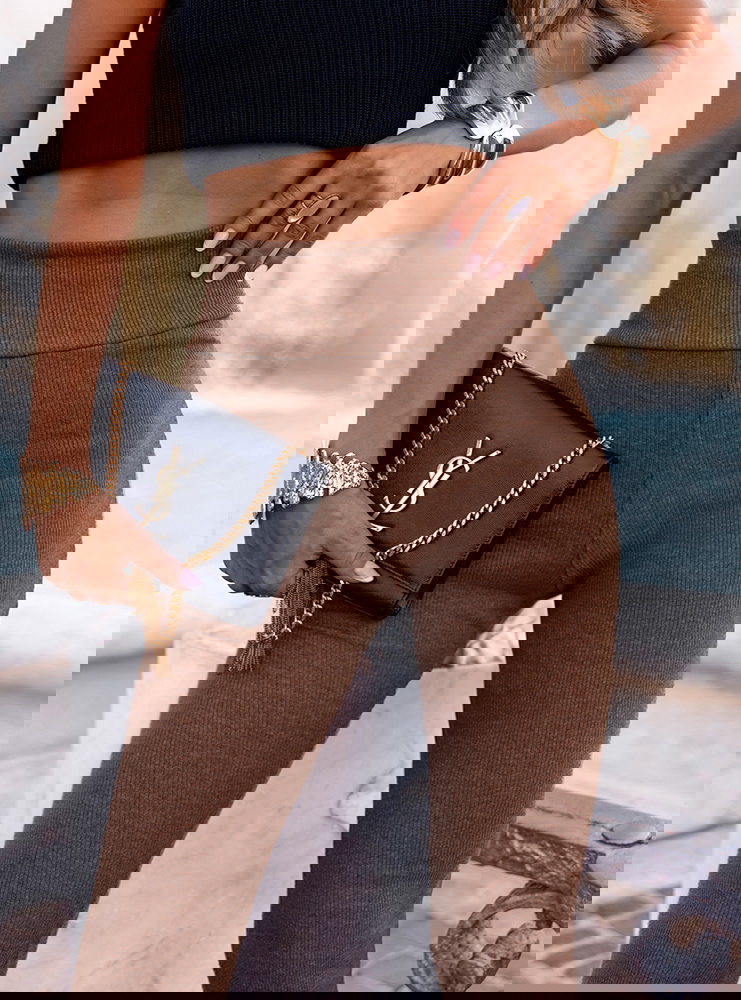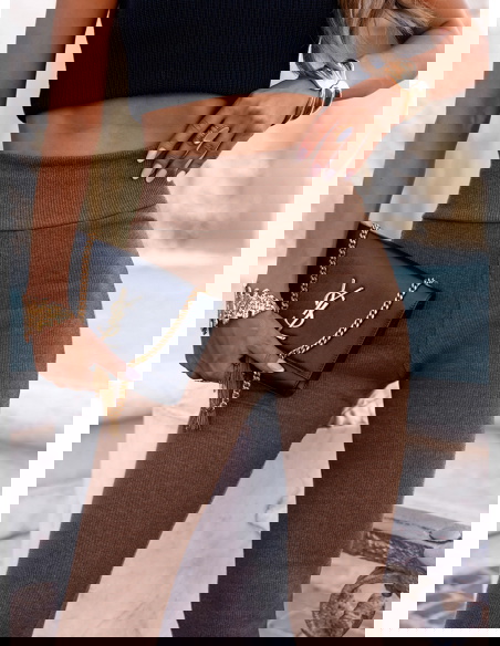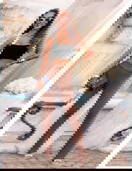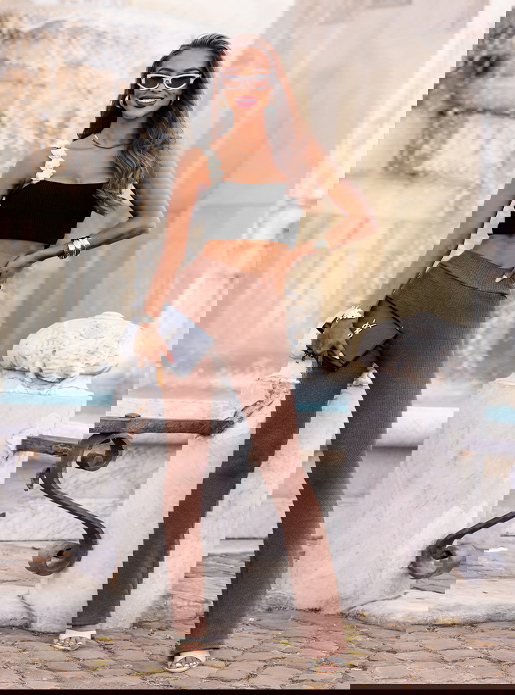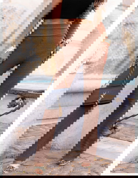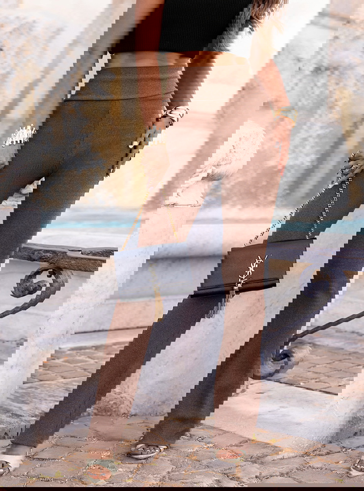 Prążkowane spodnie z rozszerzanymi nogawkami Trixie - mocha mousse to połączenie wygody i modnego szyku. Minimalistyczny krój sprawia, że spodnie łatwo dopasujesz do wielu stylizacji – od casualowych po bardziej formalne. Trixie to must-have w kobiecej garderobie, który nigdy nie traci na aktualności. Wprowadź je do swojego letniego repertuaru i ciesz się uniwersalnym, stylowym lookiem na każdą okazję.