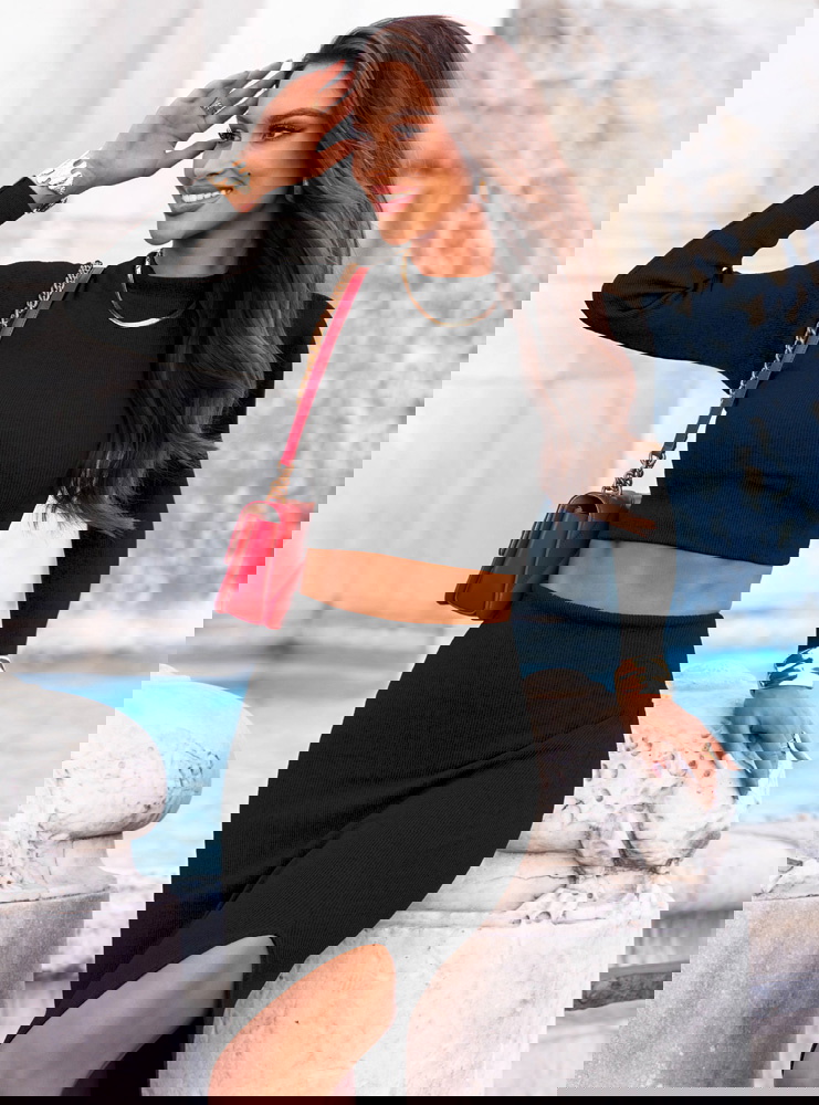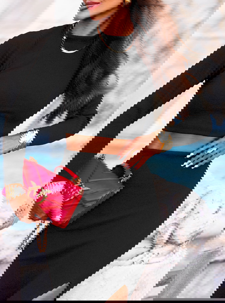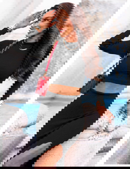 Czarny prążkowany komplet top+spódnica z rozcięciem Edvige to modowy zestaw, który warto mieć w swojej szafie na sezon prefall i nie tylko. Jest wygodny, stylowy i niezwykle łatwy do wystylizowania – niezależnie od okazji.