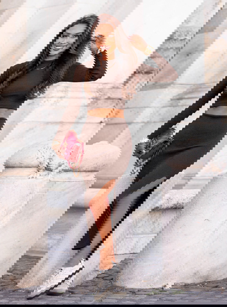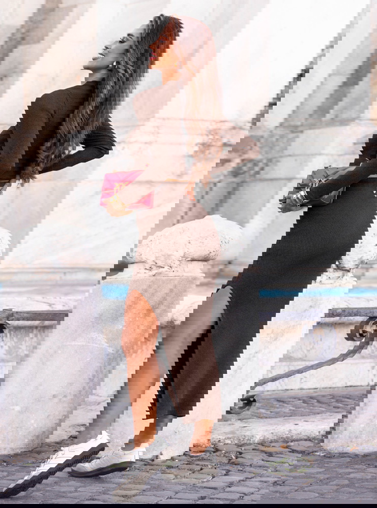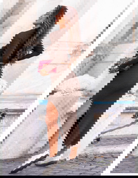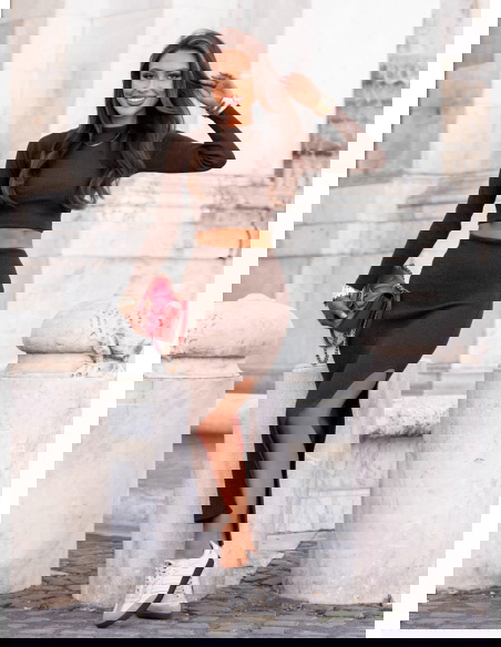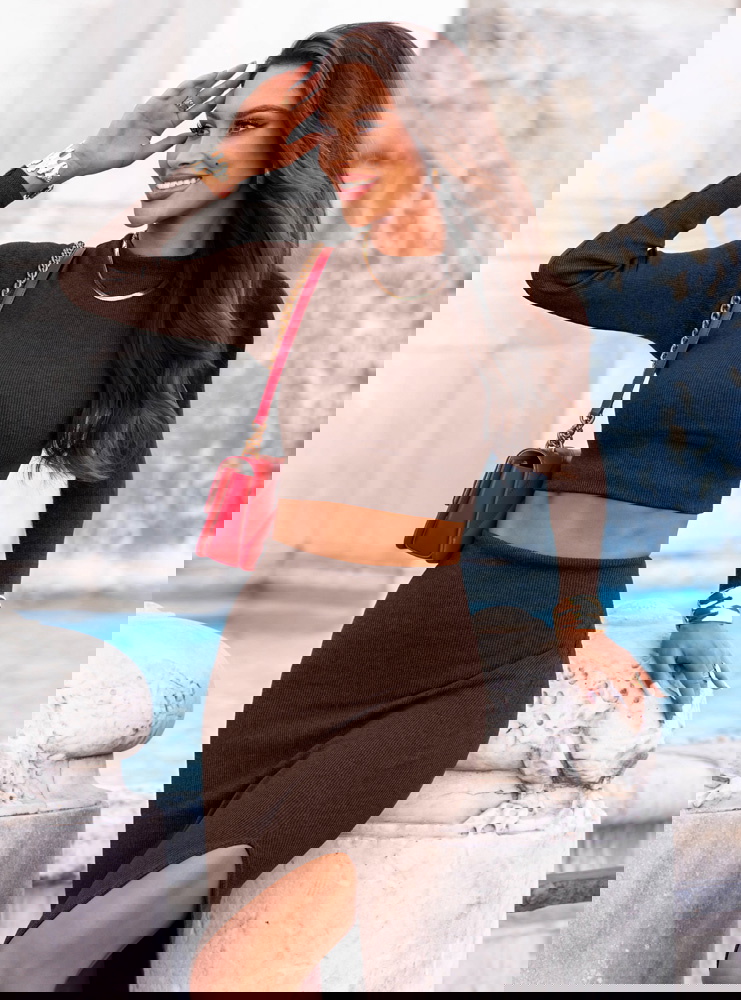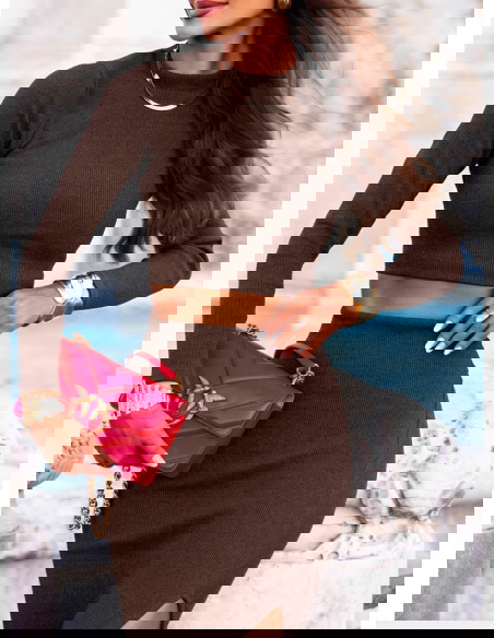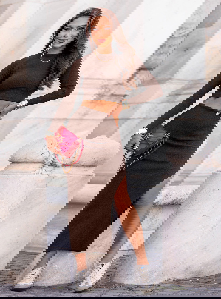 Czekoladowy prążkowany komplet top+spódnica z rozcięciem Edvige to propozycja dla kobiet, które lubią czuć się kobieco, ale nie lubią przesady. Ten zestaw doskonale łączy nowoczesną formę z wygodą i swobodą stylizacji. Prążkowana struktura materiału nadaje całości lekkości i ciekawszego wyrazu, a dopasowany krój pięknie podkreśla sylwetkę. Góra ma prosty, minimalistyczny fason z długim rękawem i długością do talii – idealnie współgrającą ze spódnicą z wysokim stanem. Całość równoważy subtelne, ale efektowne rozcięcie z boku, które dodaje zmysłowości i delikatnie odsłania nogę. Czekoladowy kolor to ciepła alternatywa dla klasycznej czerni – neutralny, ale bardzo stylowy i nowoczesny. To komplet, który możesz stylizować na sportowo ze sneakersami, jak i bardziej elegancko z butami na obcasie. Świetnie sprawdzi się jako outfit przejściowy, zwłaszcza jako część kolekcji Prefall. Minimalistyczny, ale nie nudny – idealny na dni, kiedy chcesz wyglądać dobrze bez większego wysiłku. Jeśli lubisz ubrania, które robią wrażenie w prosty sposób – to strzał w dziesiątkę.