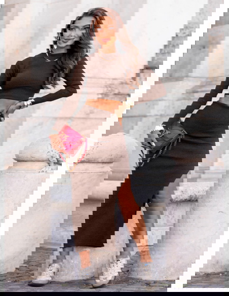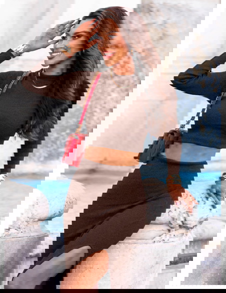 Czekoladowy prążkowany komplet top+spódnica z rozcięciem Edvige