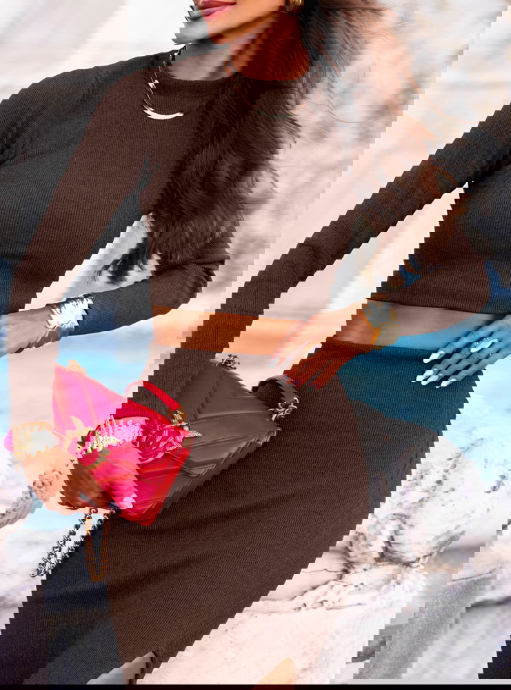 Czekoladowy prążkowany komplet top+spódnica z rozcięciem Edvige to świetna baza stylizacyjna, która łączy wygodę z modą. Prosty, ale dopracowany krój sprawia, że sylwetka wygląda kobieco i proporcjonalnie.