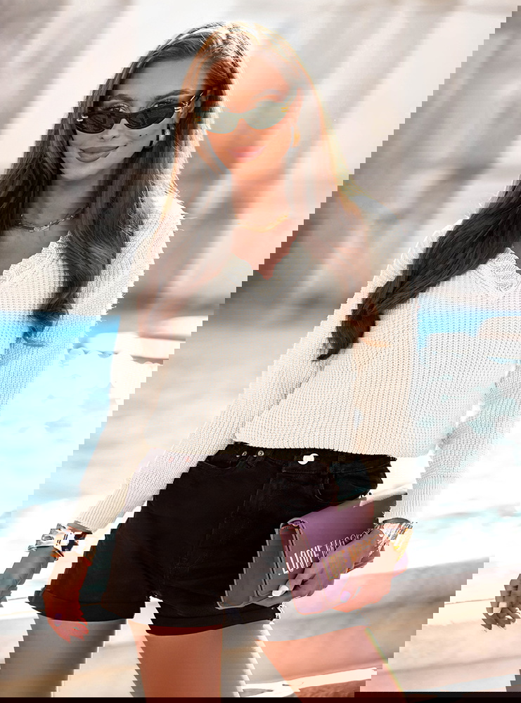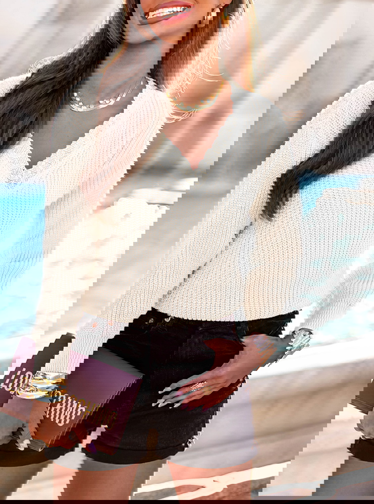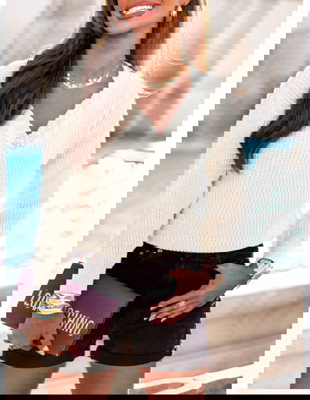 Sweter z ozdobnym dekoltem w serek Cithali - ecru będzie doskonały na wiele codziennych sytuacji – od pracy, przez spacer, aż po weekendowy wypad za miasto. Możesz go wystylizować w klasyczny sposób z jeansami lub stworzyć bardziej dopracowaną stylizację z eleganckimi spodniami i biżuterią.