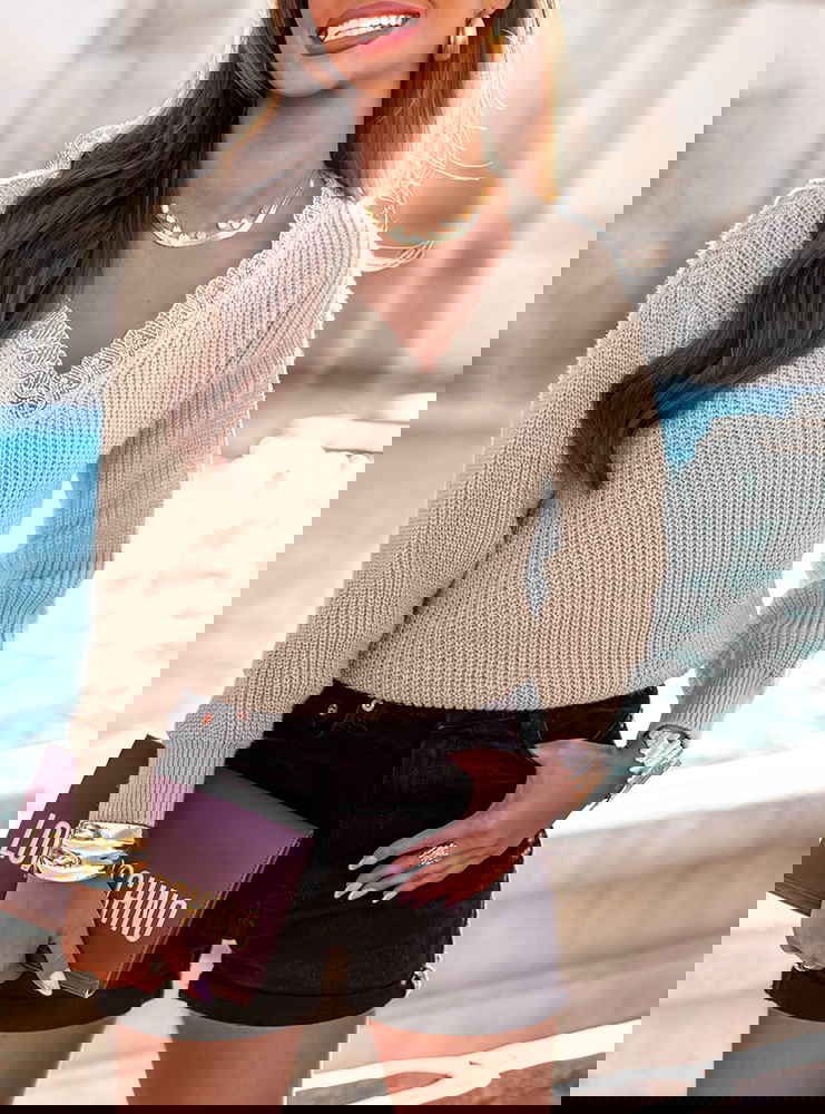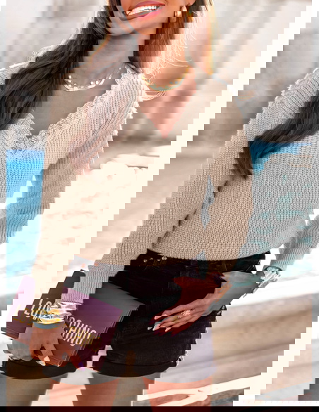 Beżowy sweter z ozdobnym dekoltem w serek Cithali