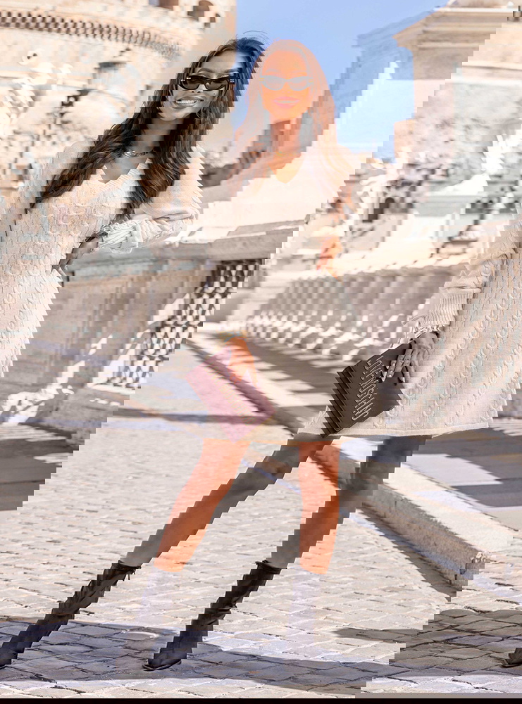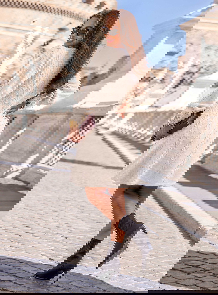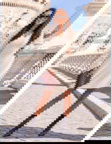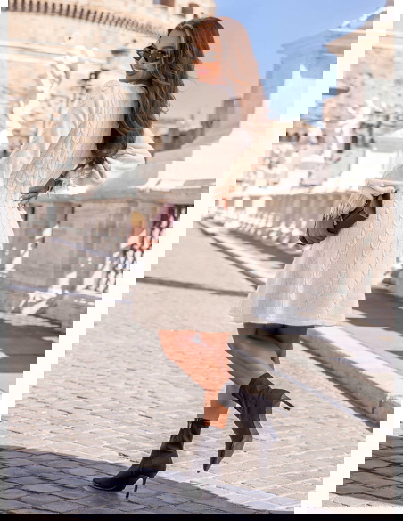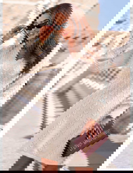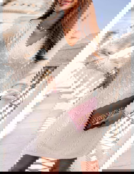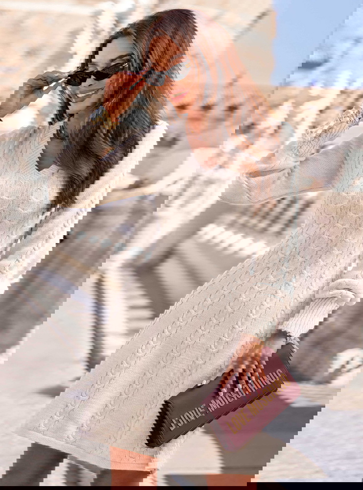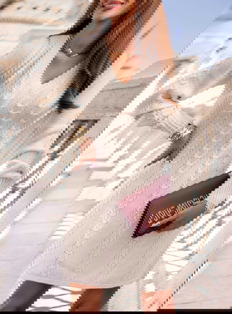 Beżowa sukienka swetrowa z długimi rękawami Furinna to propozycja, która łączy w sobie kobiecy urok i niezrównany komfort noszenia. Jej subtelny kolor wprowadza do stylizacji nutę elegancji, zachowując jednocześnie ciepły i przytulny charakter. Klasyczny, swetrowy splot o ozdobnym, warkoczowym wzorze dodaje jej wyjątkowego uroku. Dopasowana góra i lekko rozkloszowany dół tworzą harmonijną linię, która podkreśla atuty sylwetki. Dekolt w kształcie litery „V” optycznie wysmukla szyję, dodając całości lekkości. Długie rękawy nadają jej uniwersalności, sprawiając, że świetnie sprawdzi się w chłodniejsze dni. To sukienka, która nie wymaga wielu dodatków, by wyglądać efektownie – sama w sobie stanowi modną bazę. Idealna zarówno do eleganckich, jak i codziennych zestawów. W kolekcji prefall wyróżnia się swoją wszechstronnością, wpisując się w przejściowy sezon między latem a jesienią. To wybór, który sprawi, że będziesz wyglądać stylowo, czując się przy tym w pełni swobodnie.
