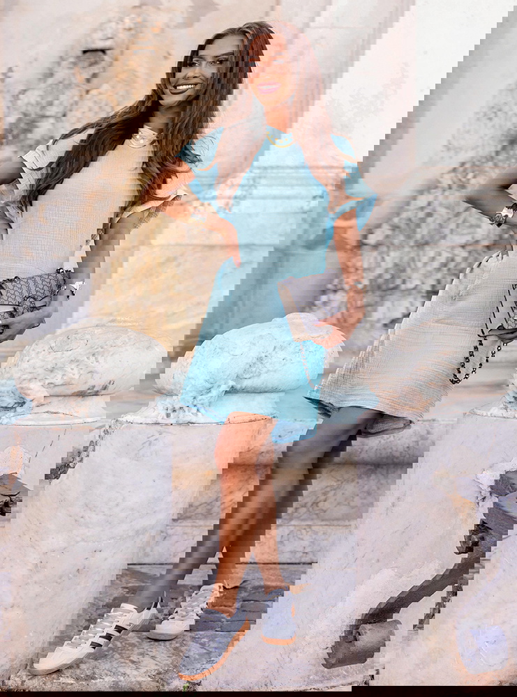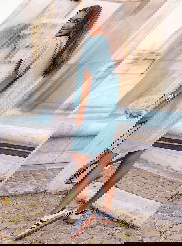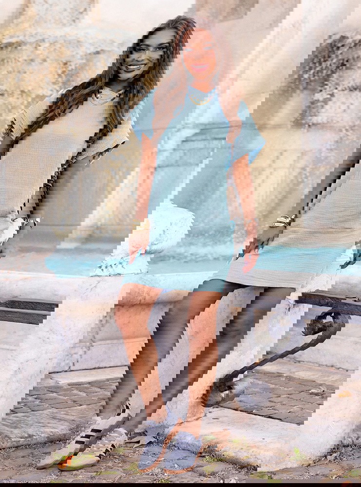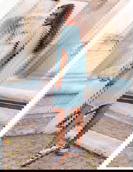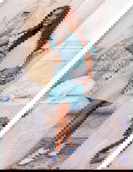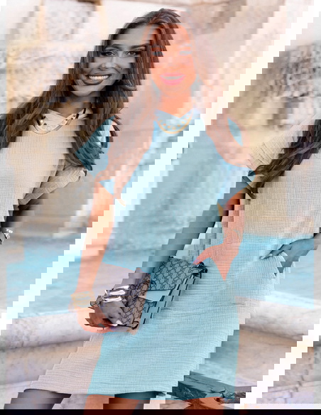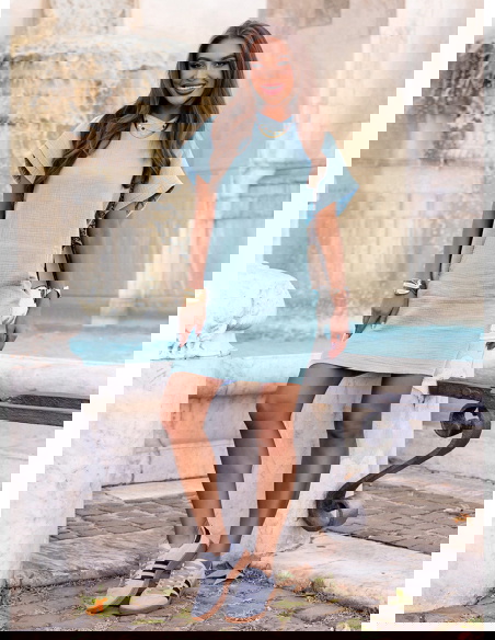 Błękitna muślinowa sukienka z kapturem Henrietta to model, który łączy sportową swobodę z kobiecym urokiem. Jej pastelowy odcień odświeża stylizację i nadaje jej lekkości.