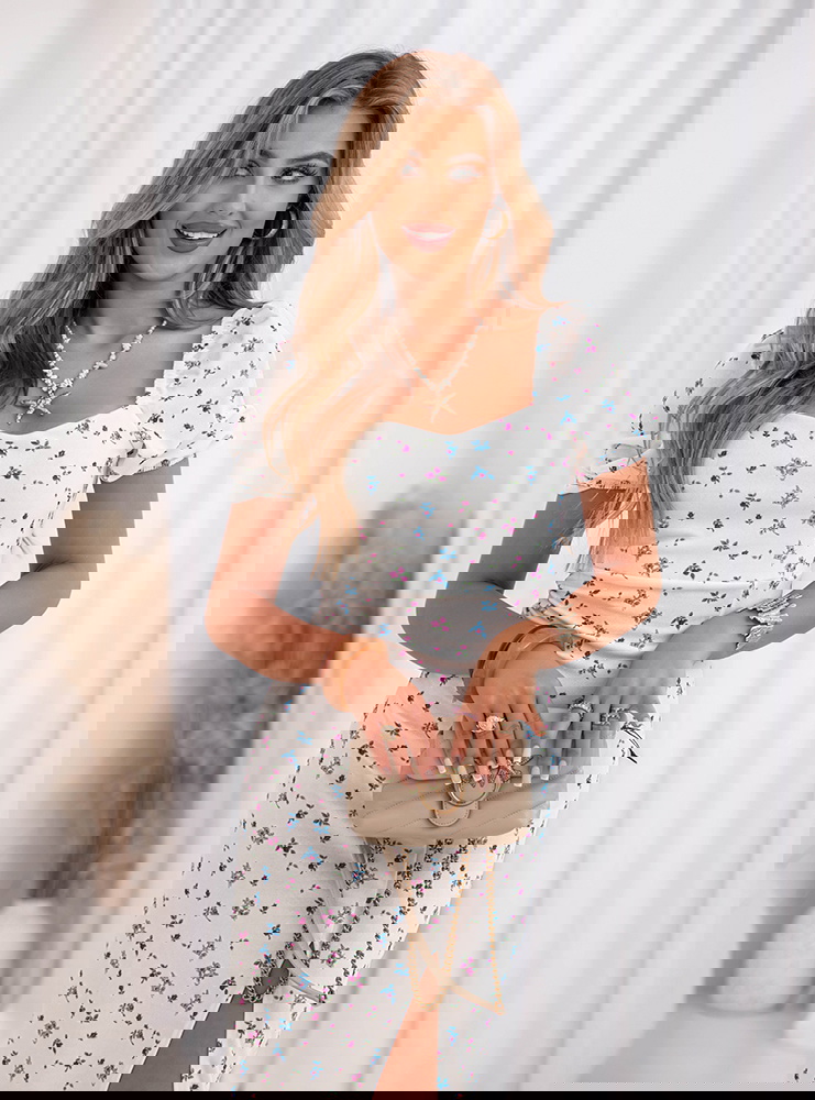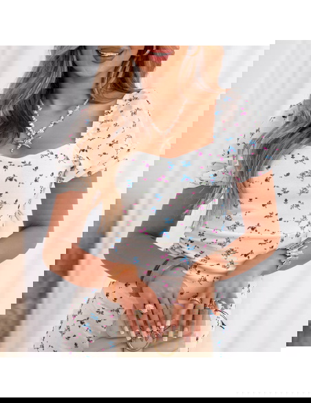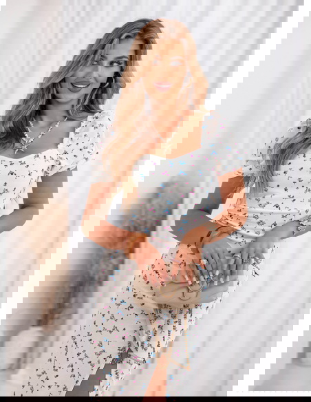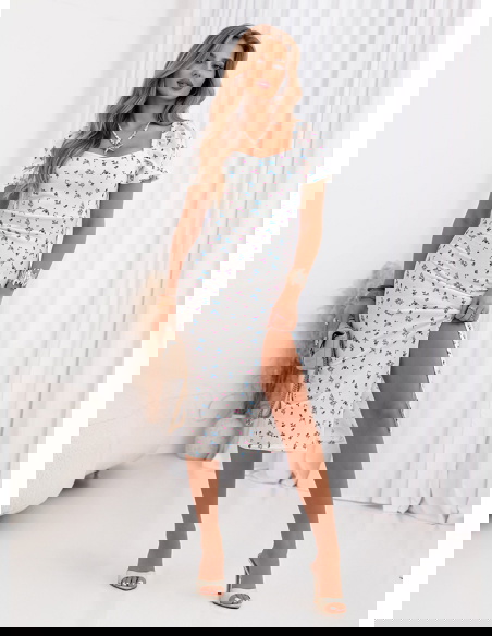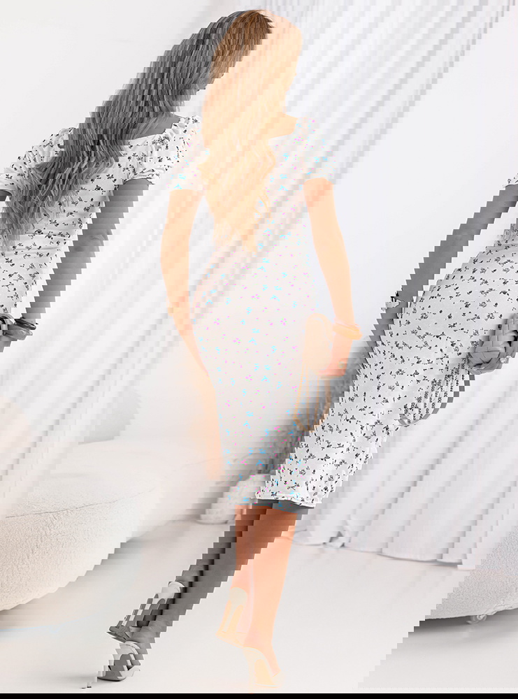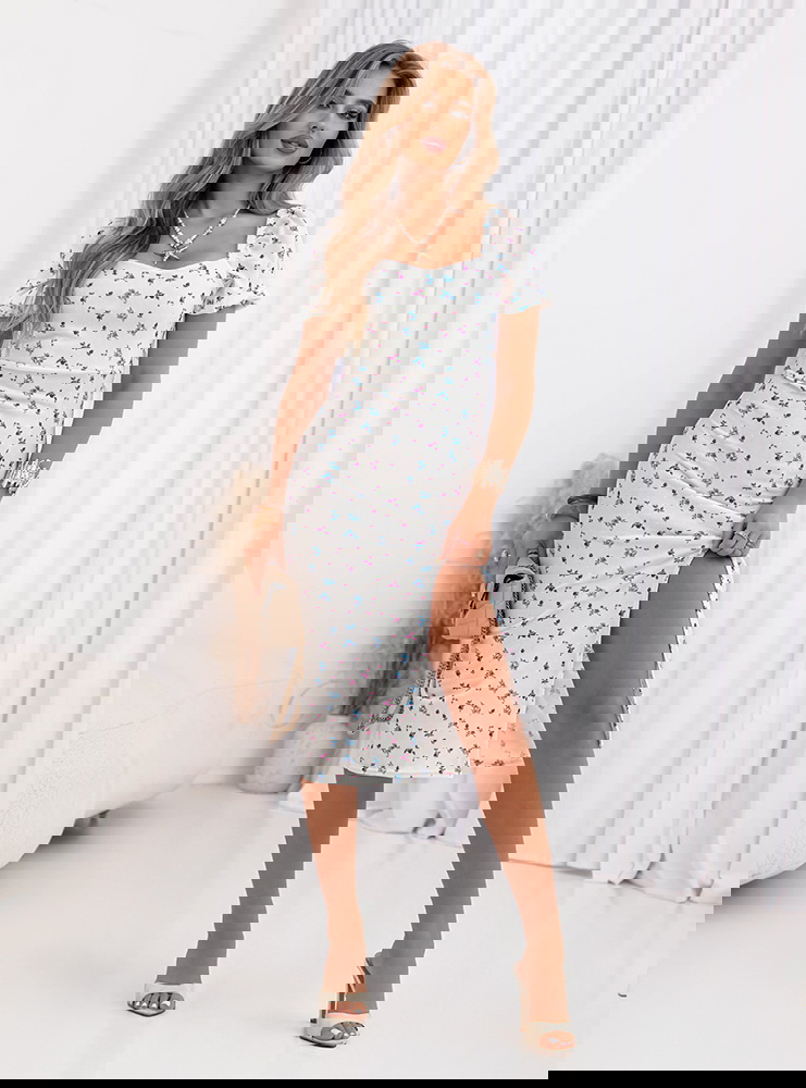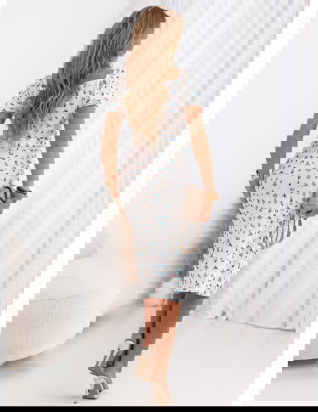 Wzorzysta sukienka z rozcięciem Disia - wzór 2511 to kwintesencja kobiecego wdzięku i świeżości. Delikatny print w drobne kwiaty nadaje jej subtelności i lekkości, a dopasowany krój pięknie podkreśla sylwetkę. Urocze krótkie rękawy dodają dziewczęcego charakteru, a jednocześnie zapewniają wygodę. Rozcięcie z przodu subtelnie eksponuje nogę, dodając całości zmysłowego akcentu. To propozycja, która łączy w sobie elegancję z codziennym luzem. Biel tła sprawia, że całość wygląda świeżo i promiennie. Wzorzysta sukienka z rozcięciem jest idealnym wyborem na dni, kiedy chcesz wyglądać stylowo bez nadmiernego wysiłku. Jej prostota połączona z efektownymi detalami tworzy wyjątkową całość. To model, który przyciąga spojrzenia, ale nie dominuje Twojego stylu. W tej sukience poczujesz się pewnie, kobieco i wyjątkowo.