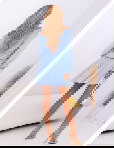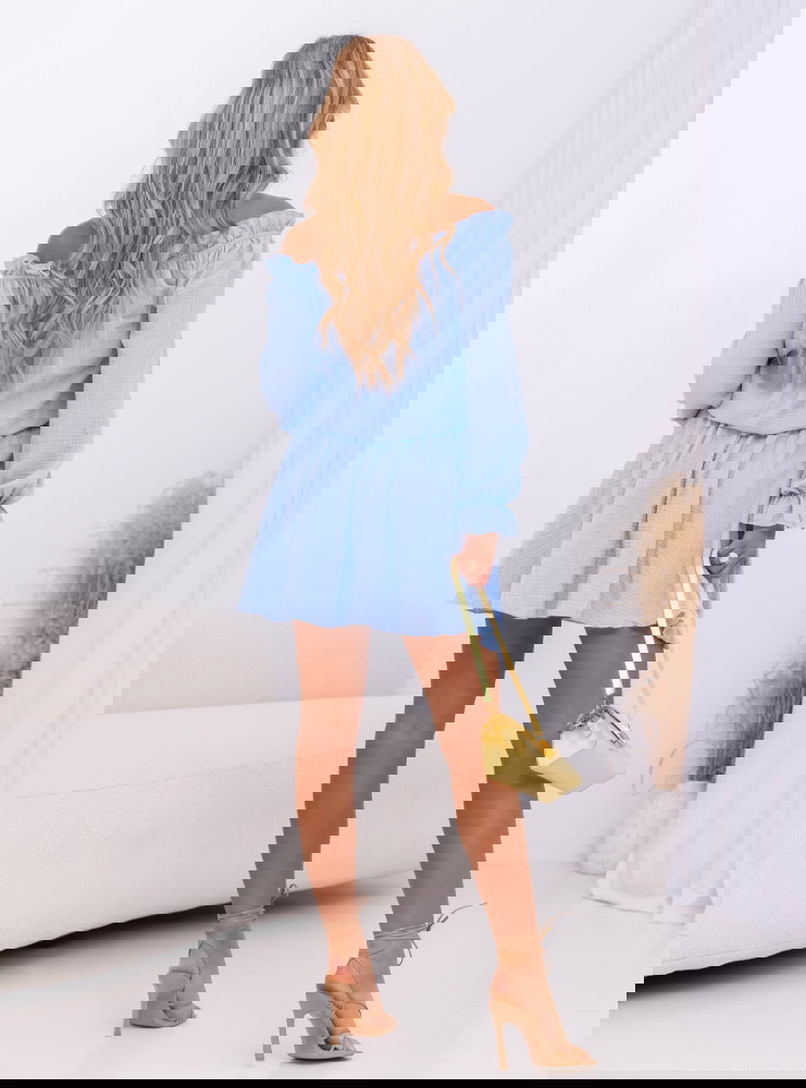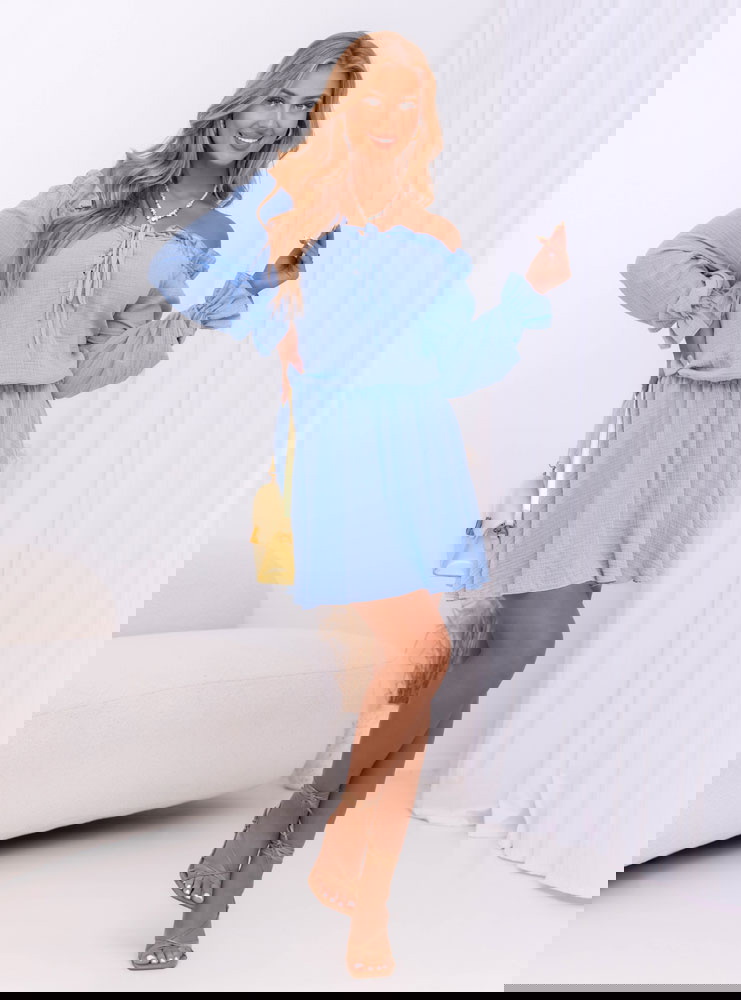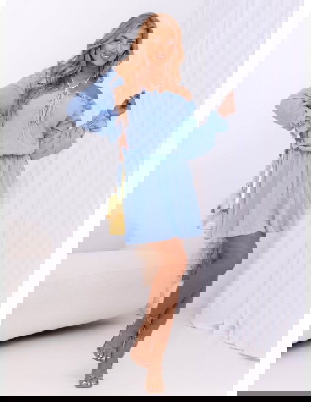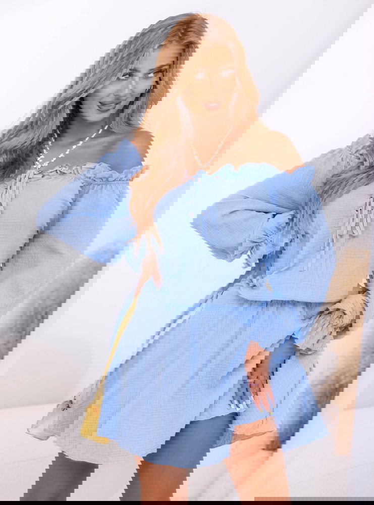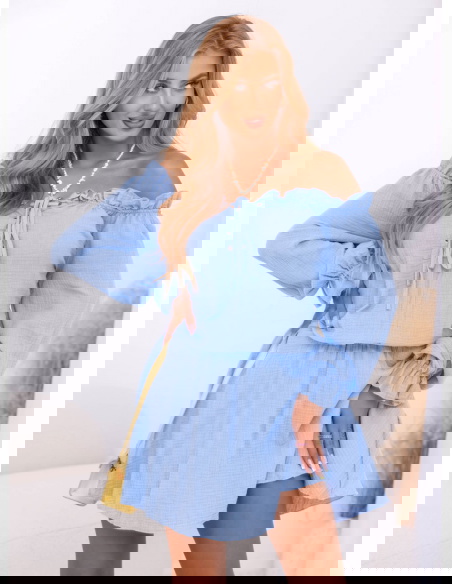 Błękitny muślinowy kombinezon jak sukienka Kimya to propozycja, która łączy w sobie urok dziewczęcej sukienki i praktyczność kombinezonu. Subtelny, pastelowy odcień błękitu sprawia, że całość prezentuje się świeżo i lekko. Dzięki przemyślanemu krojowi wygląda jak zwiewna sukienka, ale zapewnia wygodę i swobodę ruchów typową dla spodenek. Odkryte ramiona i delikatna falbanka przy dekolcie nadają mu romantycznego, letniego charakteru. Długie, bufiaste rękawy wprowadzają nutę elegancji, a wiązanie przy dekolcie dodaje całości uroku. Elastyczna talia pięknie podkreśla figurę, jednocześnie nie krępując ruchów. To model, który zachwyca swoją lekkością i wdziękiem. Idealny wybór dla kobiet ceniących modę, ale nie rezygnujących z komfortu. Sprawia, że można poczuć się jednocześnie stylowo i swobodnie. Niezależnie od okazji, ten kombinezon doda stylizacji wyjątkowego charakteru.