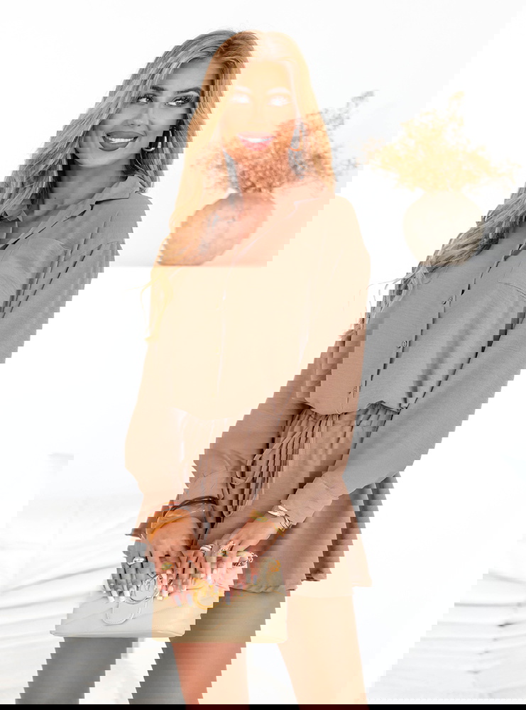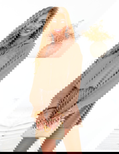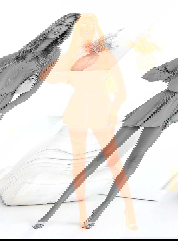 Komplet koszulowy top i rozkloszowane spodenki Raisan - mocha mousse to idealne połączenie wakacyjnej swobody i elegancji „smart casual”. Koszulowy top z kołnierzykiem i subtelnym zapięciem na guziki pięknie porządkuje sylwetkę, a miękka, lekko lejąca tkanina dodaje całości lekkości. Rozkloszowane spodenki z elastyczną talią i wiązaniem pracują przy każdym kroku – delikatnie falują, wysmuklają nogi i zapewniają pełen komfort noszenia. Ciepły, deserowy odcień moka świetnie łączy się ze złotą biżuterią, plecionymi dodatkami i jasnymi sandałkami. To zestaw, który w kilka sekund stworzy gotową stylizację – od porannej kawy w mieście po letni wieczór na tarasie.