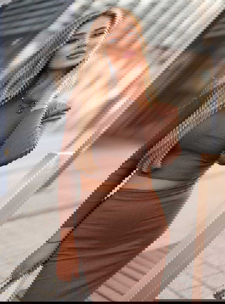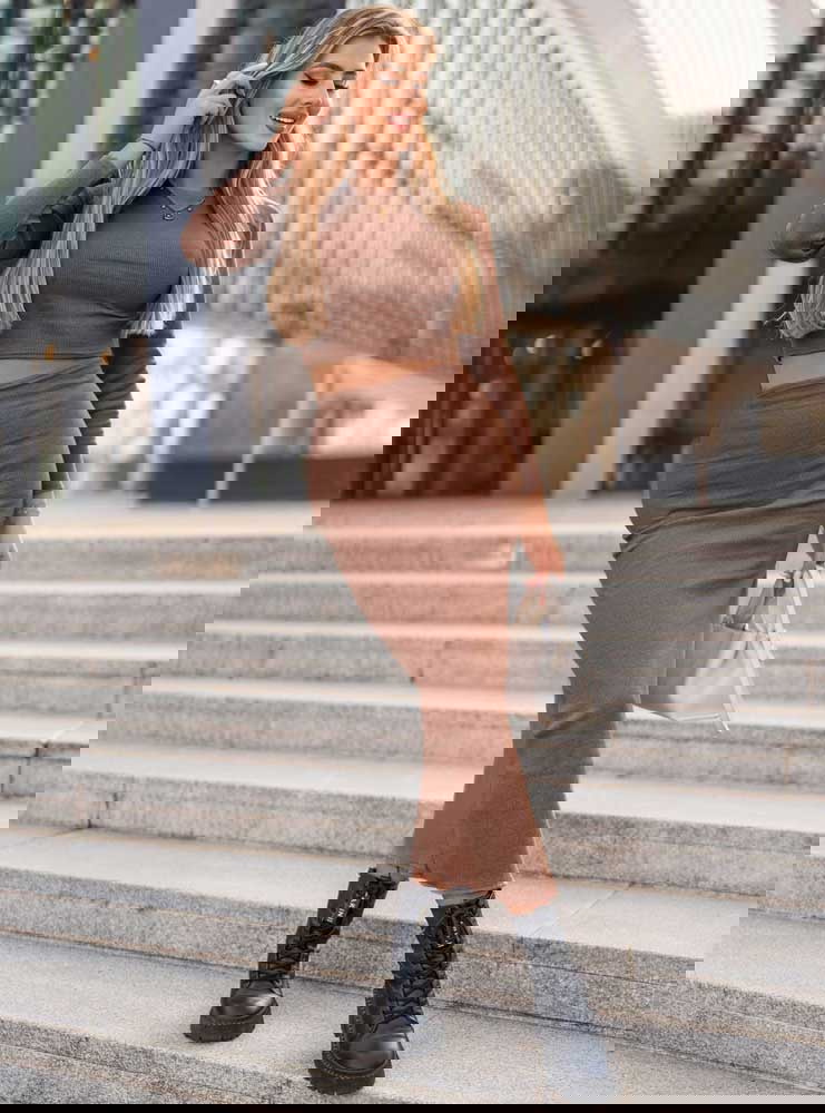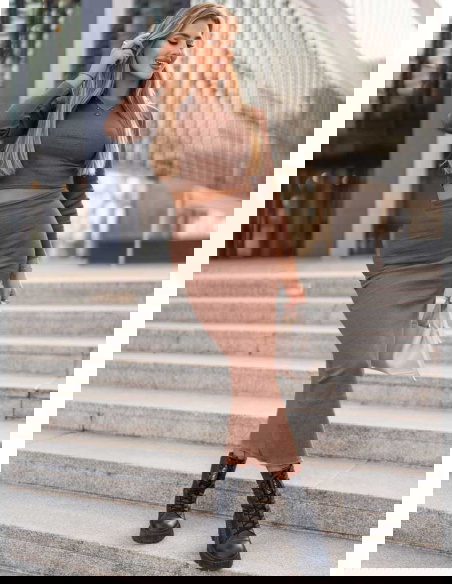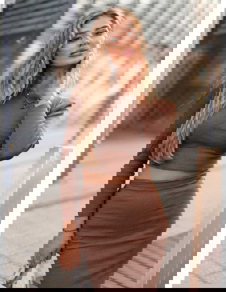 Prążkowany komplet top+spódnica z rozcięciem Keelyn - mocha mousse