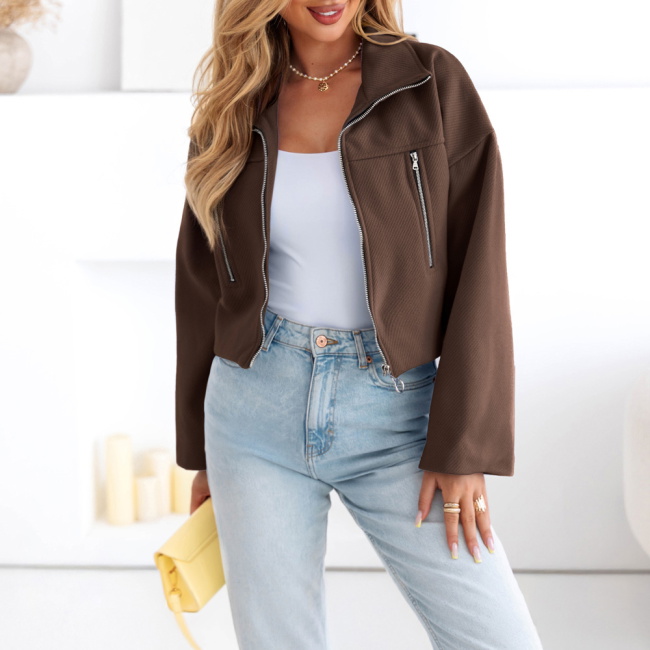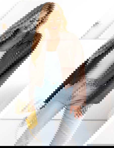 Kurtka zapinana na zamek Taralyn - mocha mousse to nowoczesny model, który świetnie sprawdzi się w codziennych stylizacjach. Ma krótki fason, który pięknie podkreśla sylwetkę. Z przodu znajdują się praktyczne kieszenie zapinane na zamki, dodające jej charakteru. Kołnierz z możliwością rozpięcia nadaje całości lekko sportowego stylu. Materiał jest wygodny i przyjemny w noszeniu. To kurtka, która pasuje zarówno do jeansów, jak i spódnic czy szortów. Dzięki prostemu designowi łatwo dopasować ją do różnych stylizacji. Zapięcie na zamek zapewnia komfort i funkcjonalność. Model idealny na przejściowe pory roku. To propozycja dla kobiet ceniących połączenie prostoty i elegancji.