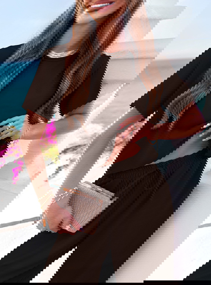 Czekoladowy komplet bluzka z krótkim rękawem i spodnie Esperanza to wyjątkowa propozycja, która łączy modny wygląd z wygodą. Dzięki prostemu fasonowi jest niezwykle uniwersalny i pasuje do wielu okazji. Możesz go stylizować zarówno na sportowo, jak i w bardziej eleganckiej odsłonie. Głęboki odcień brązu podkreśla jego charakter i dodaje klasy. To komplet, który sprawi, że zawsze będziesz wyglądać modnie i czuć się komfortowo. Z łatwością dopasujesz do niego dodatki, tworząc różnorodne stylizacje. To must-have w garderobie każdej kobiety, która ceni prostotę i styl w jednym.