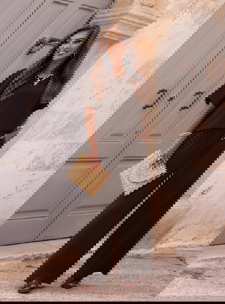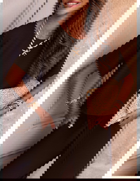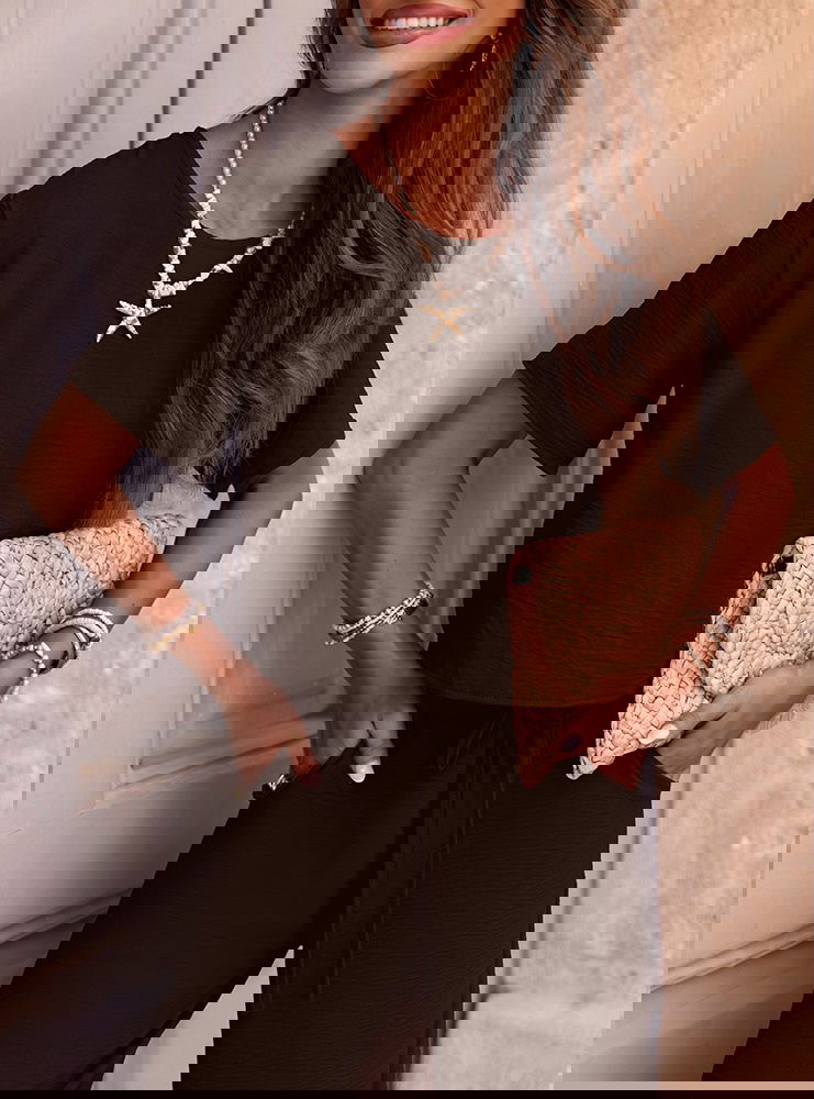 Czekoladowy komplet bluzka z krótkim rękawem i szerokie spodnie Annastasia to uniwersalna propozycja, która pozwala poczuć się stylowo w każdej sytuacji. Dzięki prostemu krojowi jest niezwykle ponadczasowy i łatwy do stylizacji. To połączenie elegancji z lekkością, które świetnie wpisuje się w wakacyjny klimat. Głęboki odcień czekoladowy sprawia, że zestaw wygląda wyjątkowo i z klasą. Możesz go nosić zarówno na co dzień, jak i na specjalne okazje. Wystarczy kilka dodatków, by stworzyć zupełnie różne odsłony tego samego kompletu. To must-have dla każdej kobiety, która ceni połączenie prostoty, stylu i wygody.