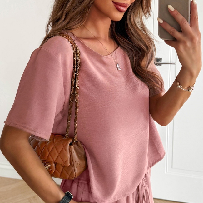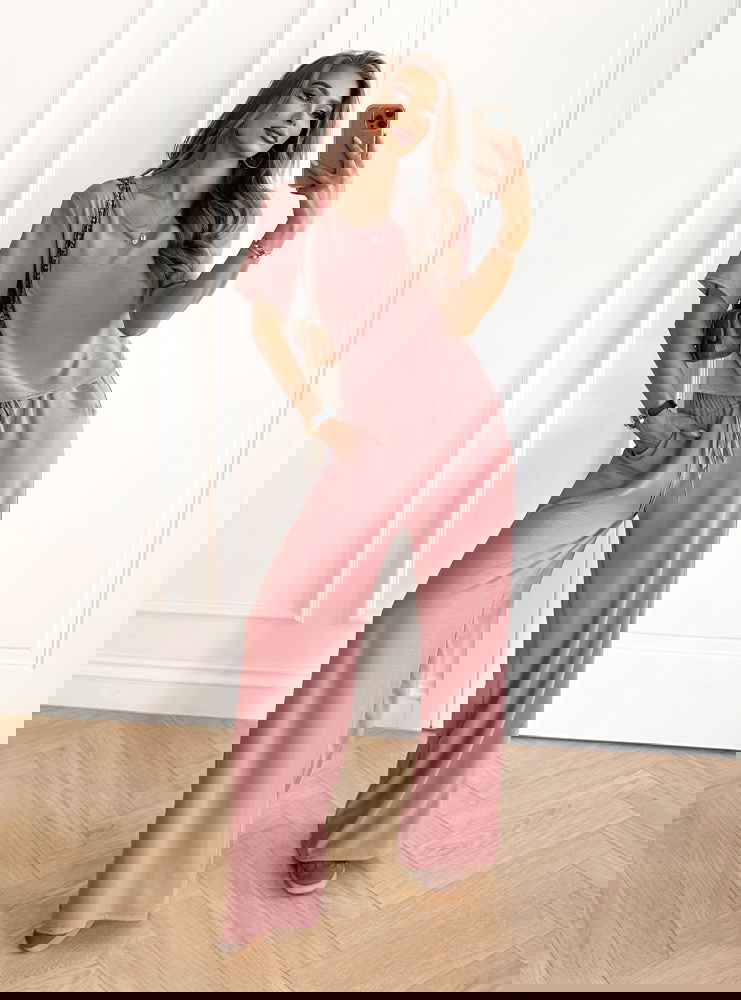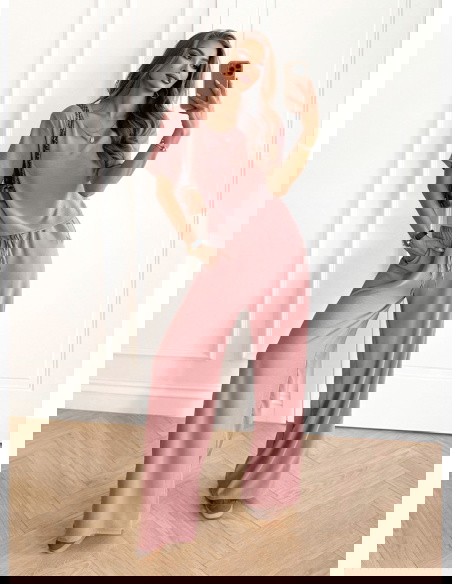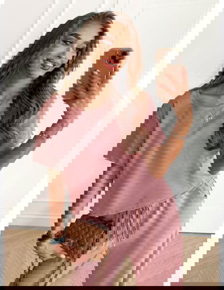 Komplet bluzka z krótkim rękawem i szerokie spodnie Rumie - brudny róż